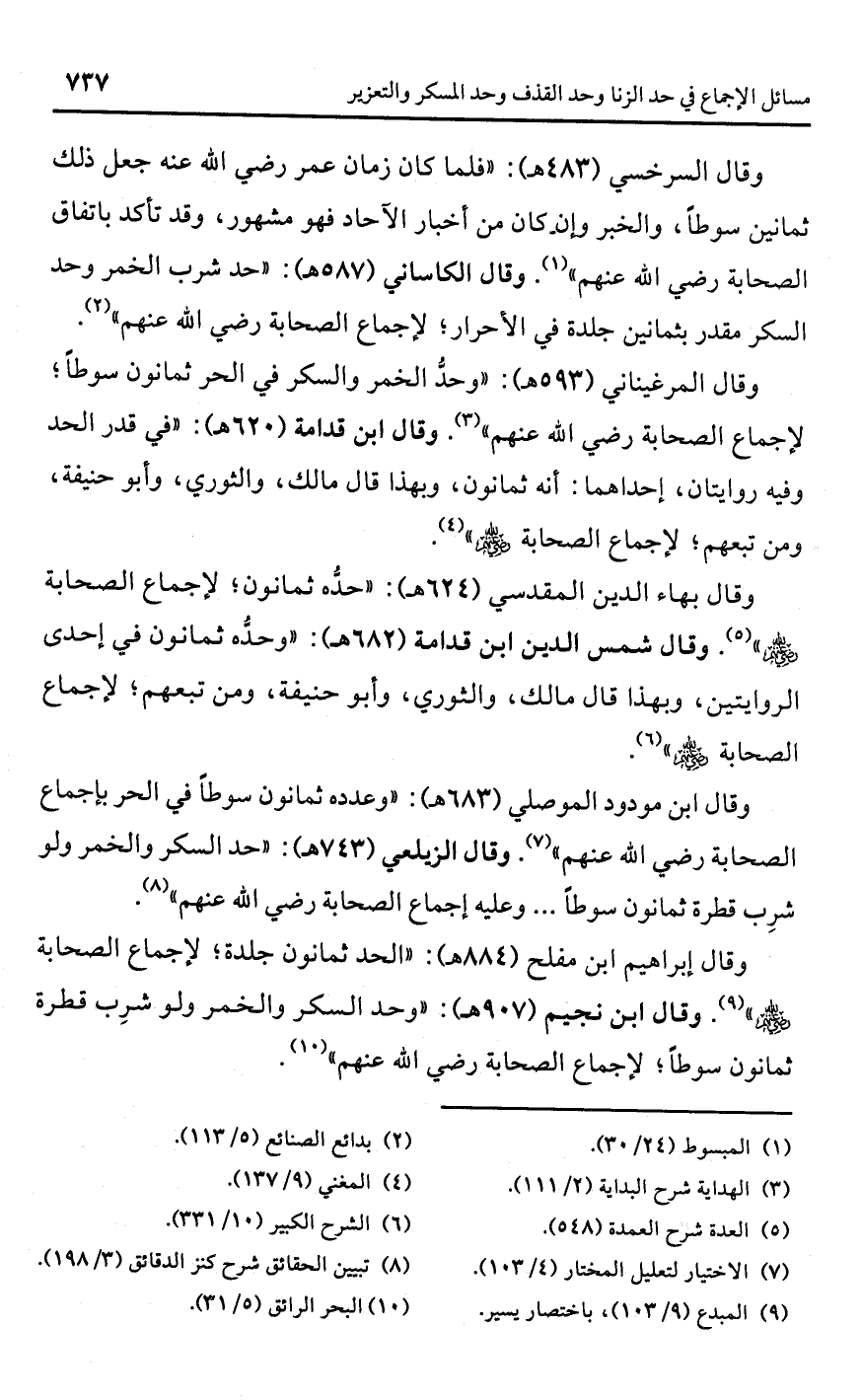 وقال المرغيناني (593 هـ): "وحدُّ الخمر والسكر في الحر ثمانون سوطًا؛ لإجماع الصحابة رضي اللَّه عنهم" (¬3). وقال ابن قدامة (620 هـ): "في قدر الحد وفيه روايتان، إحداهما: أنه ثمانون، وبهذا قال مالك، والثوري، وأبو حنيفة، ومن تبعهم؛ لإجماع الصحابة -رضي اللَّه عنهم-" (¬4).