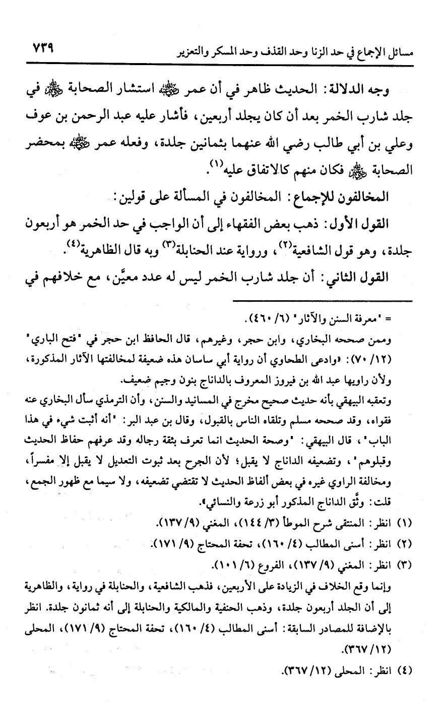 • وجه الدلالة: الحديث ظاهر في أن عمر -رضي اللَّه عنه- استشار الصحابة -رضي اللَّه عنهم- في جلد شارب الخمر بعد أن كان يجلد أربعين، فاشار عليه عبد الرحمن بن عوف وعلي بن أبي طالب رضي اللَّه عنهما بثمانين جلدة، وفعله عمر -رضي اللَّه عنه- بمحضر الصحابة -رضي اللَّه عنهم- فكان منهم كالاتفاق عليه (¬1).