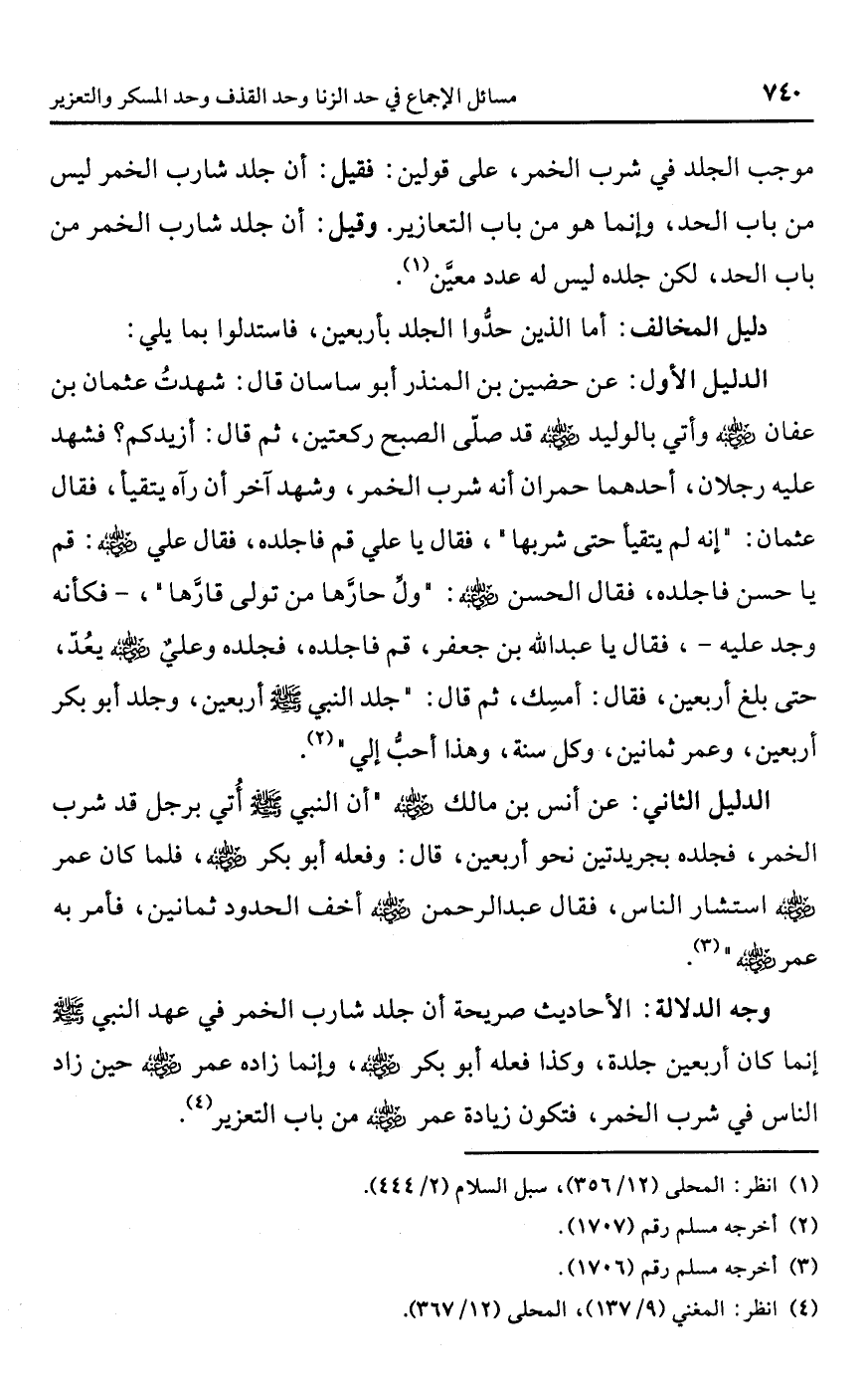 الدليل الأول: عن حضين بن المنذر أبو ساسان قال: شهدتُ عثمان بن عفان -رضي اللَّه عنه- وأتي بالوليد -رضي اللَّه عنه- قد صلّى الصبح ركعتين، ثم قال: أزيدكم؟ فشهد عليه رجلان، أحدهما حمران أنه شرب الخمر، وشهد آخر أن رآه يتقيأ، فقال عثمان: "إنه لم يتقيأ حتى شربها"، فقال يا علي قم فاجلده، فقال علي -رضي اللَّه عنه-: قم يا حسن فاجلده، فقال الحسن -رضي اللَّه عنه-: "ولِّ حارَّها من تولى قارَّها"، -فكأنه وجد عليه-، فقال يا عبد اللَّه بن جعفر، قم فاجلده، فجلده وعليٌّ -رضي اللَّه عنه- يعُدّ، حتى بلغ أربعين، فقال: أمسِك، ثم قال: "جلد النبي -رضي اللَّه عنه- أربعين، وجلد أبو بكر أربعين، وعمر ثمانين، وكل سنة، وهذا أحبُّ إلي" (¬2).
