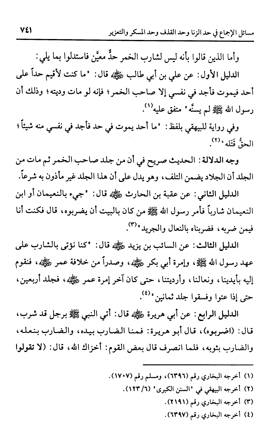 الدليل الأول: عن علي بن أبي طالب -رضي اللَّه عنه- قال: "ما كنت لأقيم حدًا على أحد فيموت فأجد في نفسي إلا صاحب الخمر؛ فإنه لو مات وديته؛ وذلك أن رسول اللَّه -صلى اللَّه عليه وسلم- لم يسنَّه" متفق عليه (¬1).