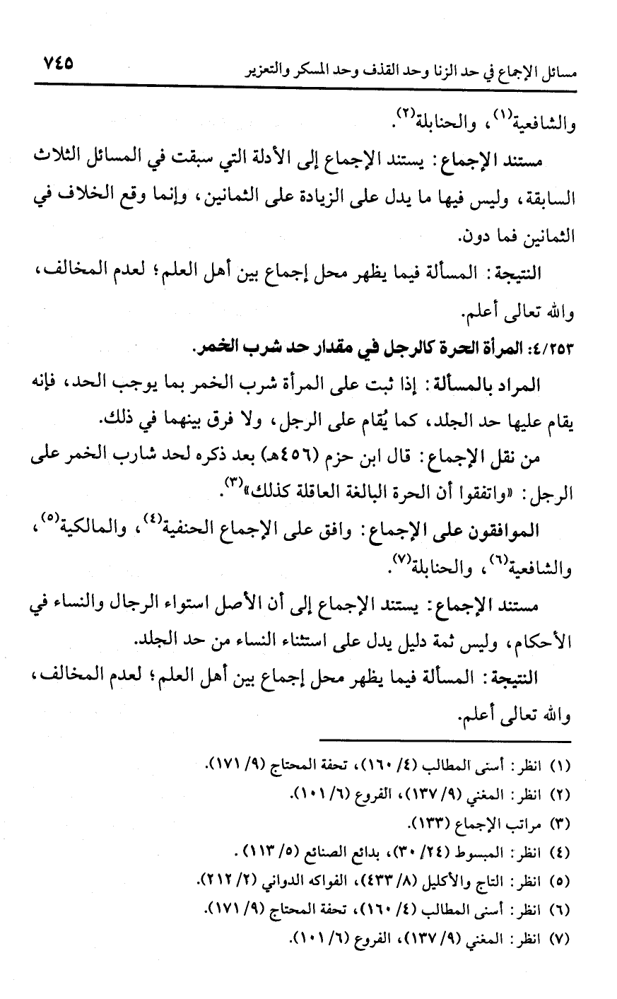 • مستند الإجماع: يستند الإجماع إلى الأدلة التي سبقت في المسائل الثلاث السابقة، وليس فيها ما يدل على الزيادة على الثمانين، وإنما وقع الخلاف في الثمانين فما دون.Rالمسألة فيما يظهر محل إجماع بين أهل العلم؛ لعدم المخالف، واللَّه تعالى أعلم.