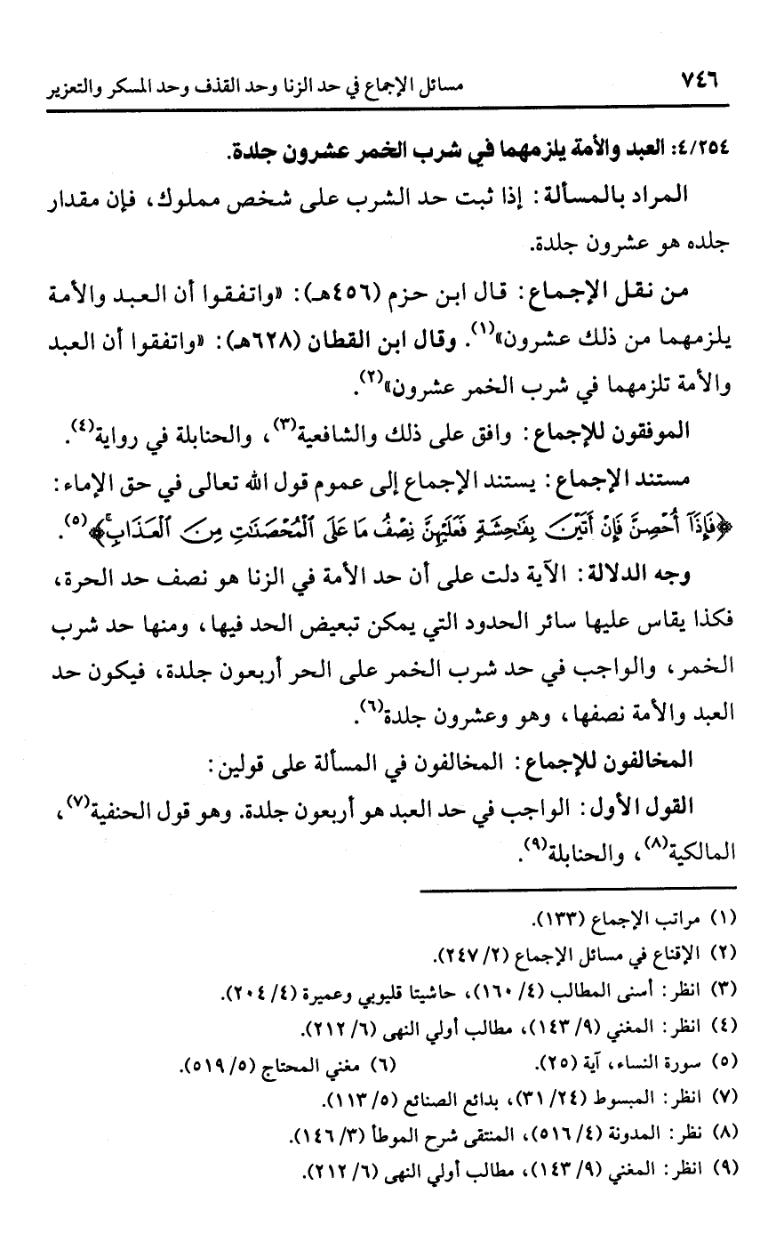 • من نقل الإجماع: قال ابن حزم (456 هـ): "واتفقوا أن العبد والأمة يلزمهما من ذلك عشرون" (¬1). وقال ابن القطان (628 هـ): "واتفقوا أن العبد والأمة تلزمهما في شرب الخمر عشرون" (¬2).