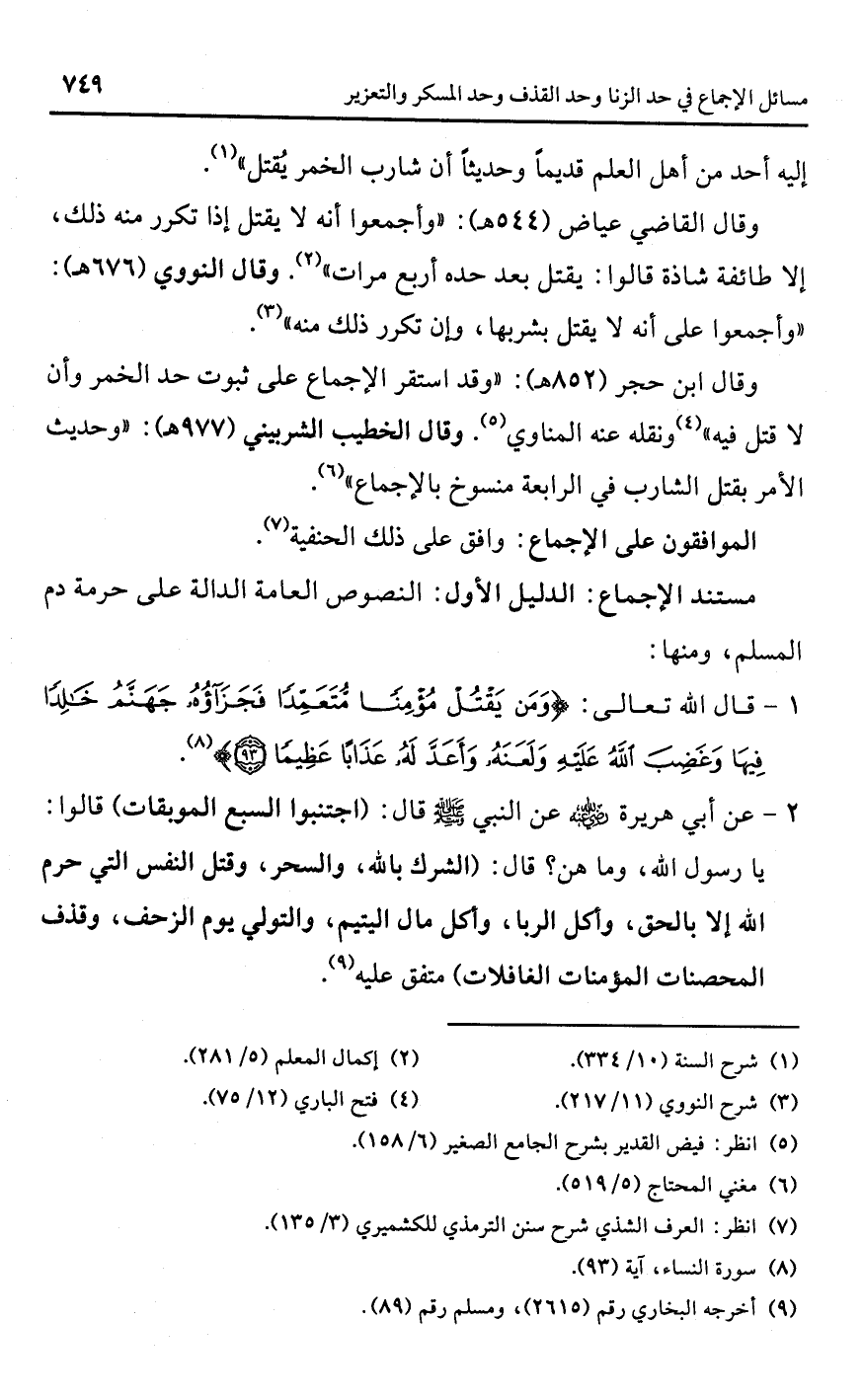 وقال القاضي عياض (544 هـ): "وأجمعوا أنه لا يقتل إذا تكرر منه ذلك، إلا طائفة شاذة قالوا: يقتل بعد حده أربع مرات" (¬2). وقال النووي (676 هـ): "وأجمعوا على أنه لا يقتل بشربها، وإن تكرر ذلك منه" (¬3).
