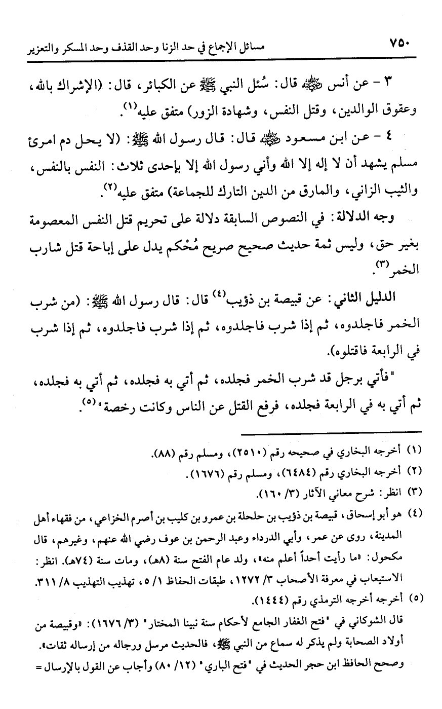 الدليل الثاني: عن قبيصة بن ذؤيب (¬4) قال: قال رسول اللَّه -صلى اللَّه عليه وسلم-: (من شرب الخمر فاجلدوه، ثم إذا شرب فاجلدوه، ثم إذا شرب فاجلدوه، ثم إذا شرب في الرابعة فاقتلوه).