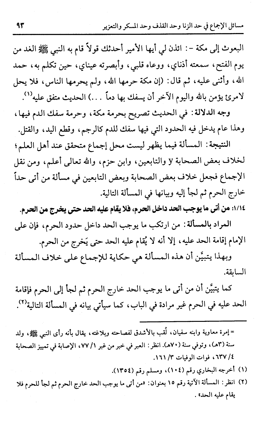 (¬2) انظر: المسألة الآتية رقم 15 بعنوان: "من أتى ما يوجب الحد خارج الحرم ثم لجأ للحرم فلا يقام عليه الحد".