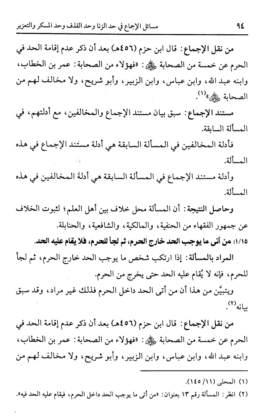 • من نقل الإجماع: قال ابن حزم (456 هـ) بعد أن ذكر عدم إقامة الحد في الحرم عن خمسة من الصحابة -رضي اللَّه عنهم-: "فهؤلاء من الصحابة: عمر بن الخطاب، وابنه عبد اللَّه، وابن عباس، وابن الزبير، وأبو شريح، ولا مخالف لهم من الصحابة -رضي اللَّه عنهم- (¬1).