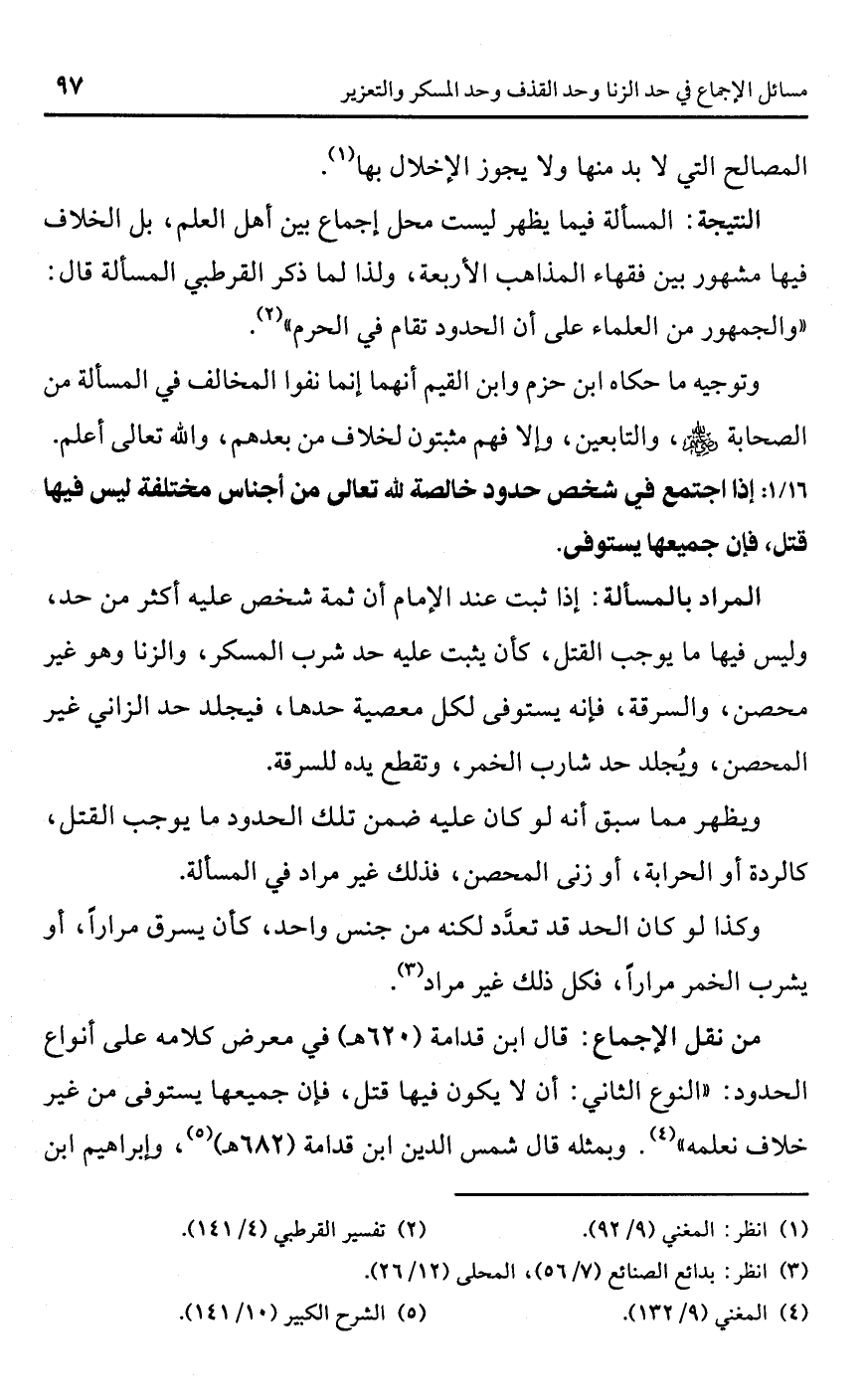 المصالح التي لا بد منها ولا يجوز الإخلال بها (¬1).Rالمسألة فيما يظهر ليست محل إجماع بين أهل العلم، بل الخلاف فيها مشهور بين فقهاء المذاهب الأربعة، ولذا لما ذكر القرطبي المسألة قال: "والجمهور من العلماء على أن الحدود تقام في الحرم" (¬2).