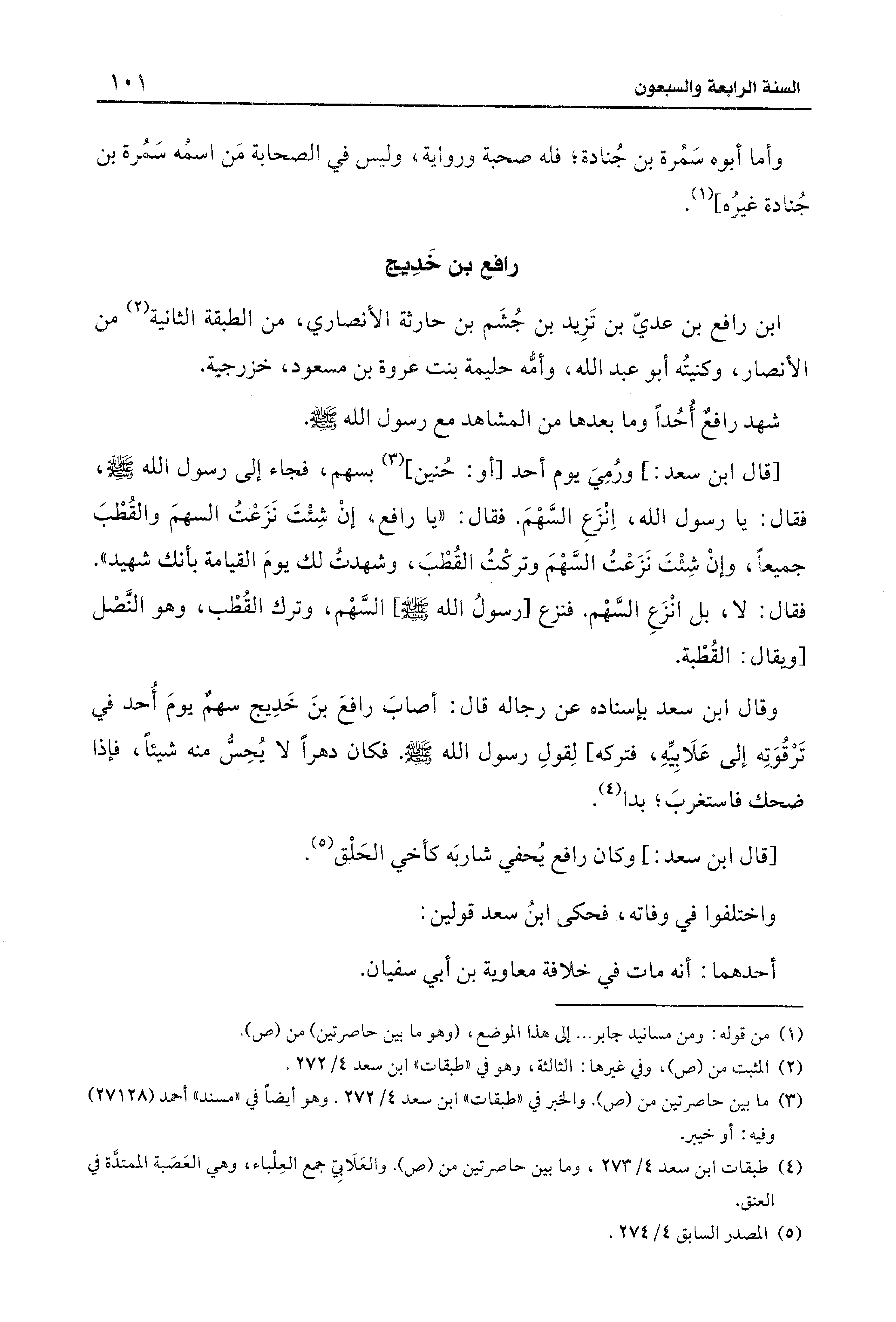 وقال ابن سعد بإسناده عن رجاله قال: أصابَ رافعَ بنَ خَدِيج سهمٌ يومَ أُحد في تَرْقُوَتِه إلى عَلَابِيِّهِ، فتركه] لِقولِ رسول الله - صلى الله عليه وسلم -. فكان دهرًا لا يُحِسُّ منه شيئًا، فإذا ضحك فاستغربَ؛ بدا (¬4).