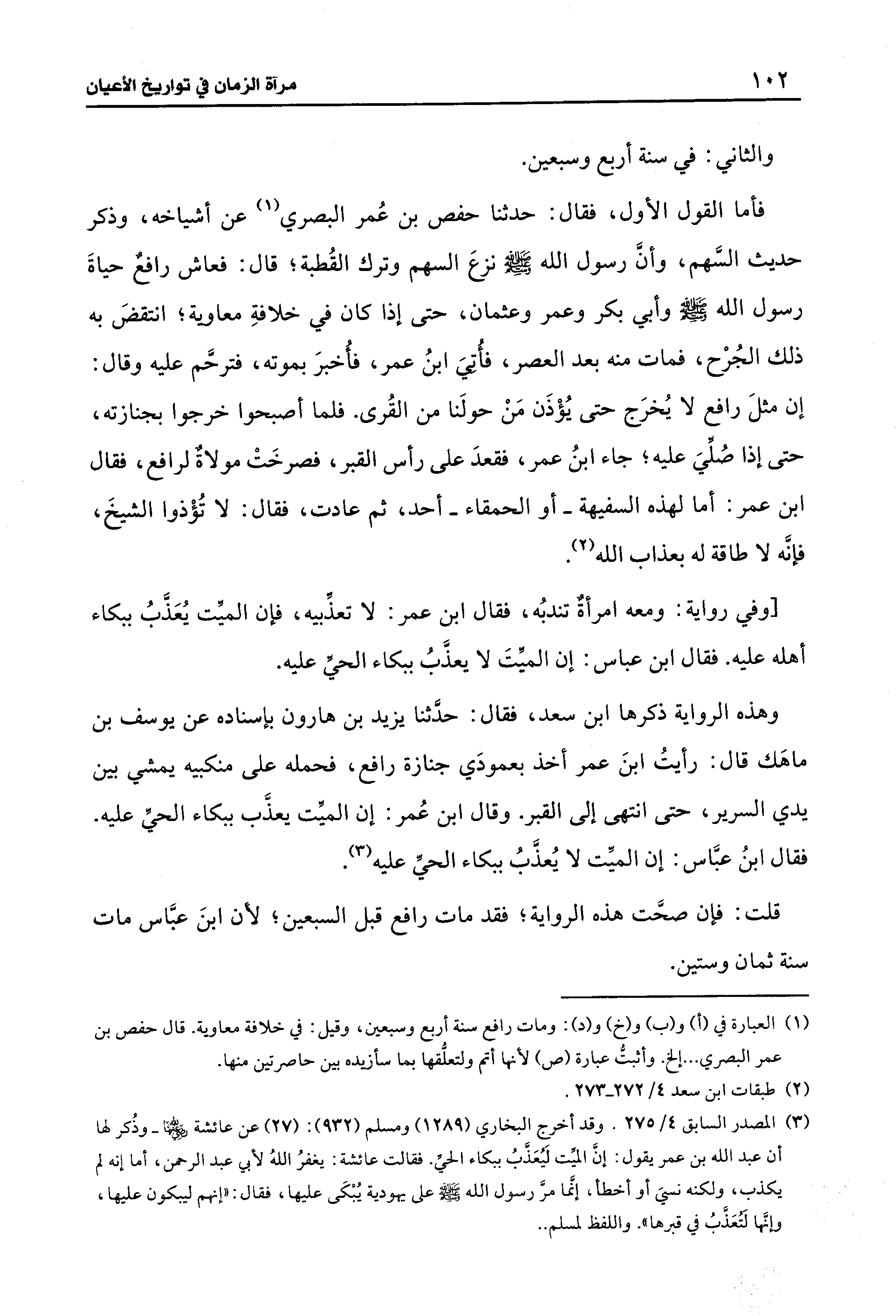 (¬1) العبارة في (أ) و (ب) و (خ) و (د): ومات رافع سنة أربع وسبعين، وقيل: في خلافة معاوية. قال حفص بن عمر البصري ... الخ. وأثبتُ عبارة (ص) لأنها أتم ولتعلُّقها بما سأزيده بين حاصرتين منها.