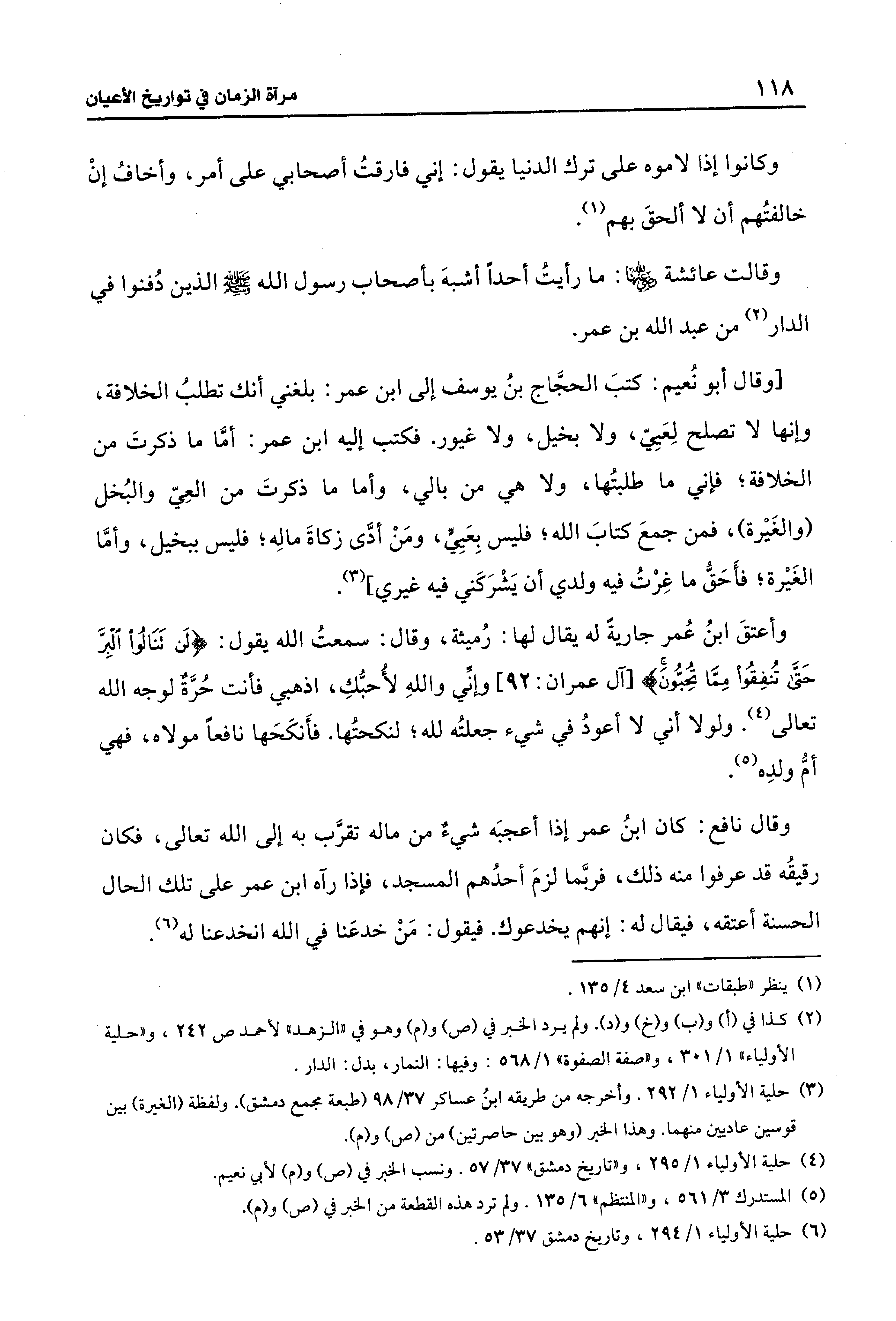 [وقال أبو نُعيم: كتبَ الحجَّاج بنُ يوسف إلى ابن عمر: بلغني أنك تطلبُ الخلافة، وإنها لا تصلح لِعَيِيَّ، ولا بخيل، ولا غيور. فكتب إليه ابن عمر: أمَّا ما ذكرتَ من الخلافة؛ فإني ما طلبتُها, ولا هي من بالي، وأما ما ذكرتَ من العِيّ والبُخل (والغَيرة)، فمن جمعَ كتابَ الله؛ فليس بِعَيِيٍّ، ومَنْ أدَّى زكاةَ مالِه؛ فليس ببخيل، وأمَّا الغَيرة؛ فأَحَقُّ ما غِرْتُ فيه ولدي أن يَشْرَكَني فيه غيري] (¬3).