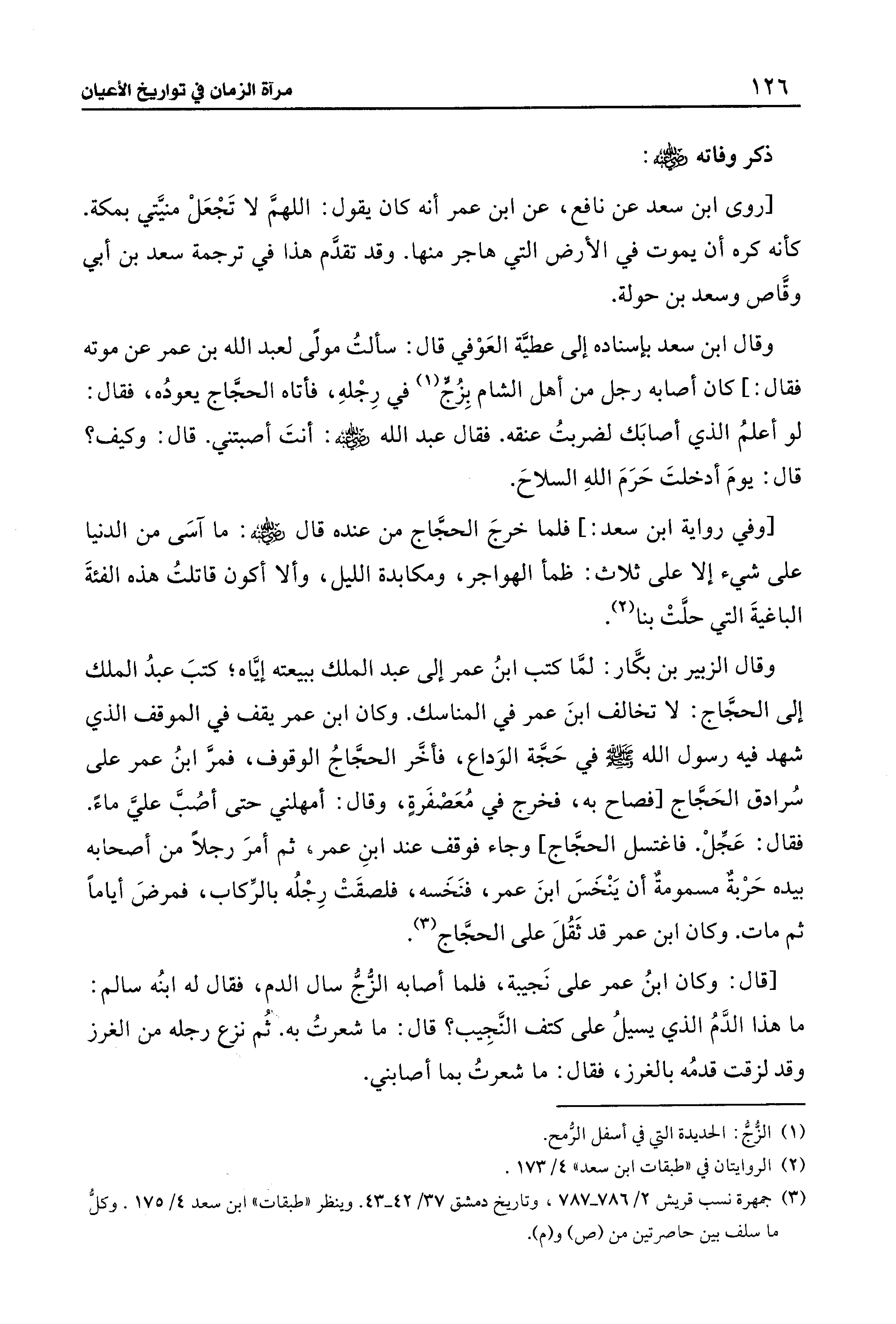وقال ابن سعد بإسناده إلى عطيَّة العَوْفي قال: سألتُ مولًى لعبد الله بن عمر عن موته فقال: ] كان أصابه رجل من أهل الشام بِزُجٍّ (¬1) في رِجْلهِ، فأتاه الحجَّاج يعودُه، فقال: لو أعلمُ الذي أصابَك لضربتُ عنقه. فقال عبد الله - رضي الله عنه -: أنتَ أصبتني. قال: وكيف؟ قال: يومَ أدخلتَ حَرَمَ اللهِ السلاحَ.