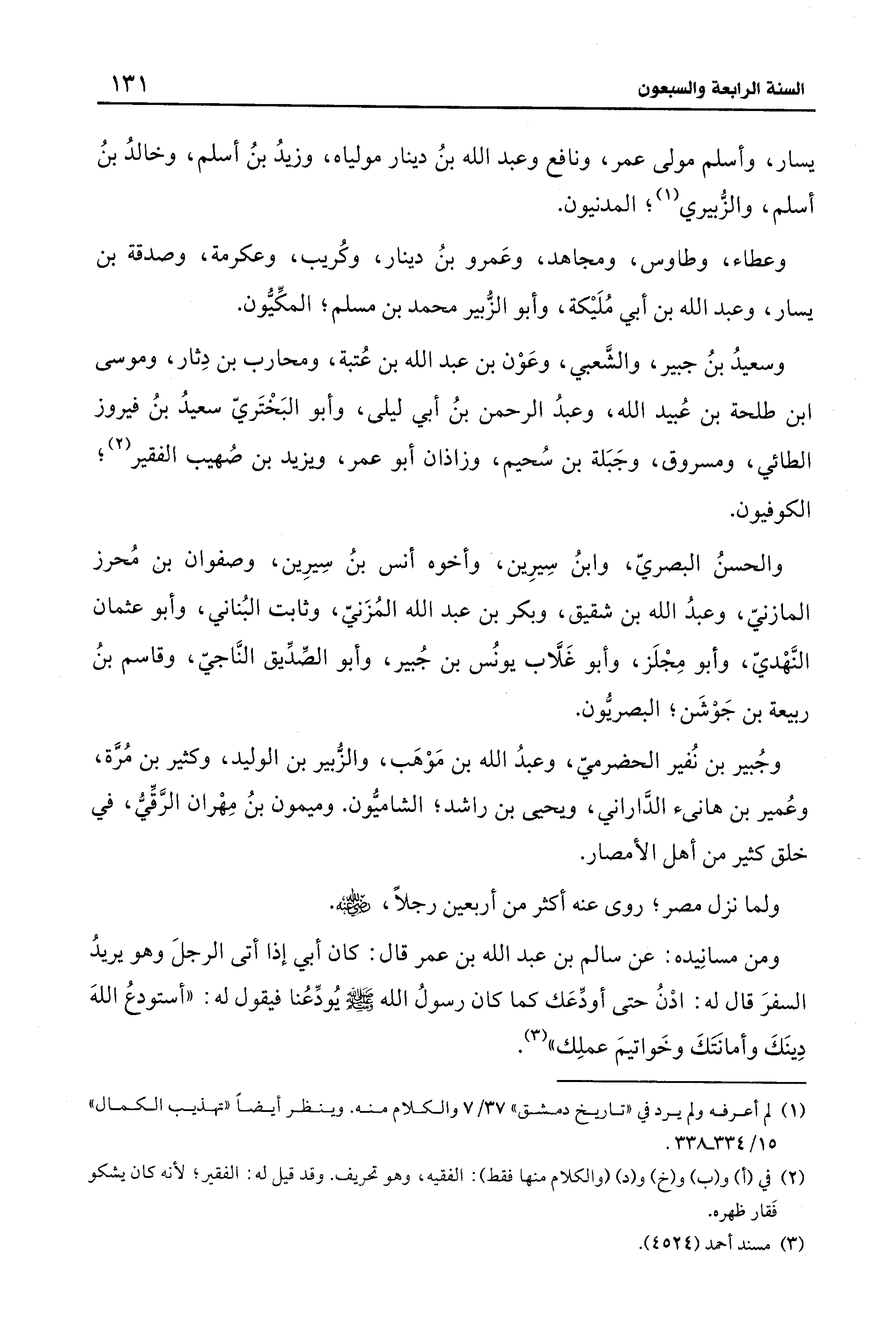 ومن مسانِيده: عن سالم بن عبد الله بن عمر قال: كان أبي إذا أتى الرجلَ وهو يريدُ السفرَ قال له: ادْنُ حتى أودِّعَك كما كان رسولُ الله - صلى الله عليه وسلم - يُودِّعُنا فيقول له: "أستودعُ اللهَ دِينَكَ وأمانتَكَ وخَواتيمَ عملِك" (¬3).