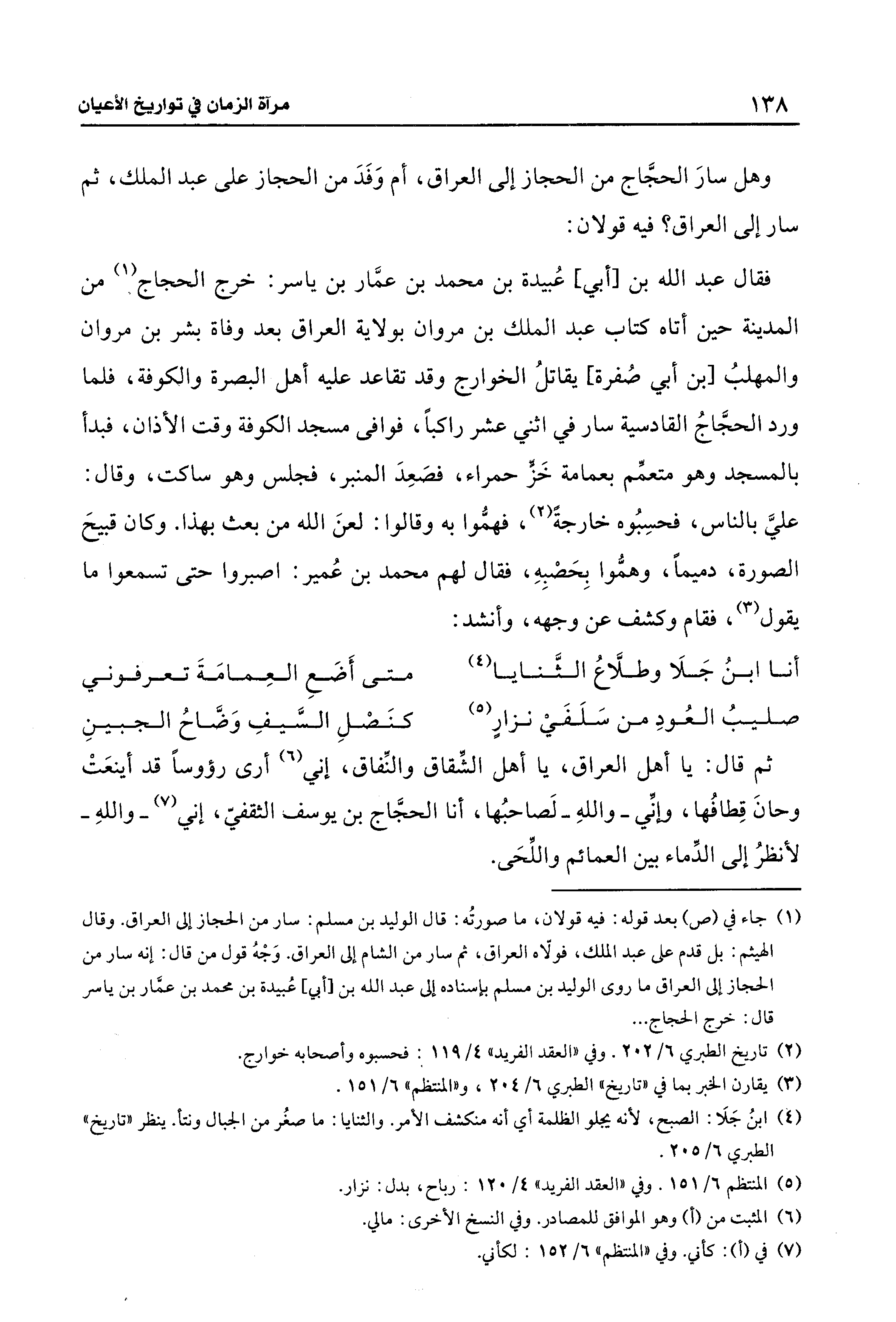 (¬1) جاء في (ص) بعد قوله: فيه قولان، ما صورتُه: قال الوليد بن مسلم: سار من الحجاز إلى العراق. وقال الهيثم: بل قدم على عبد الملك، فولّاه العراق، ثم سار من الشام إلى العراق. وَجْهُ قول من قال: إنه سار من الحجاز إلى العراق ما روى الوليد بن مسلم بإسناده إلى عبد الله بن [أبي] عُبيدة بن محمد بن عمار بن ياسر قال: خرج الحجاج ...