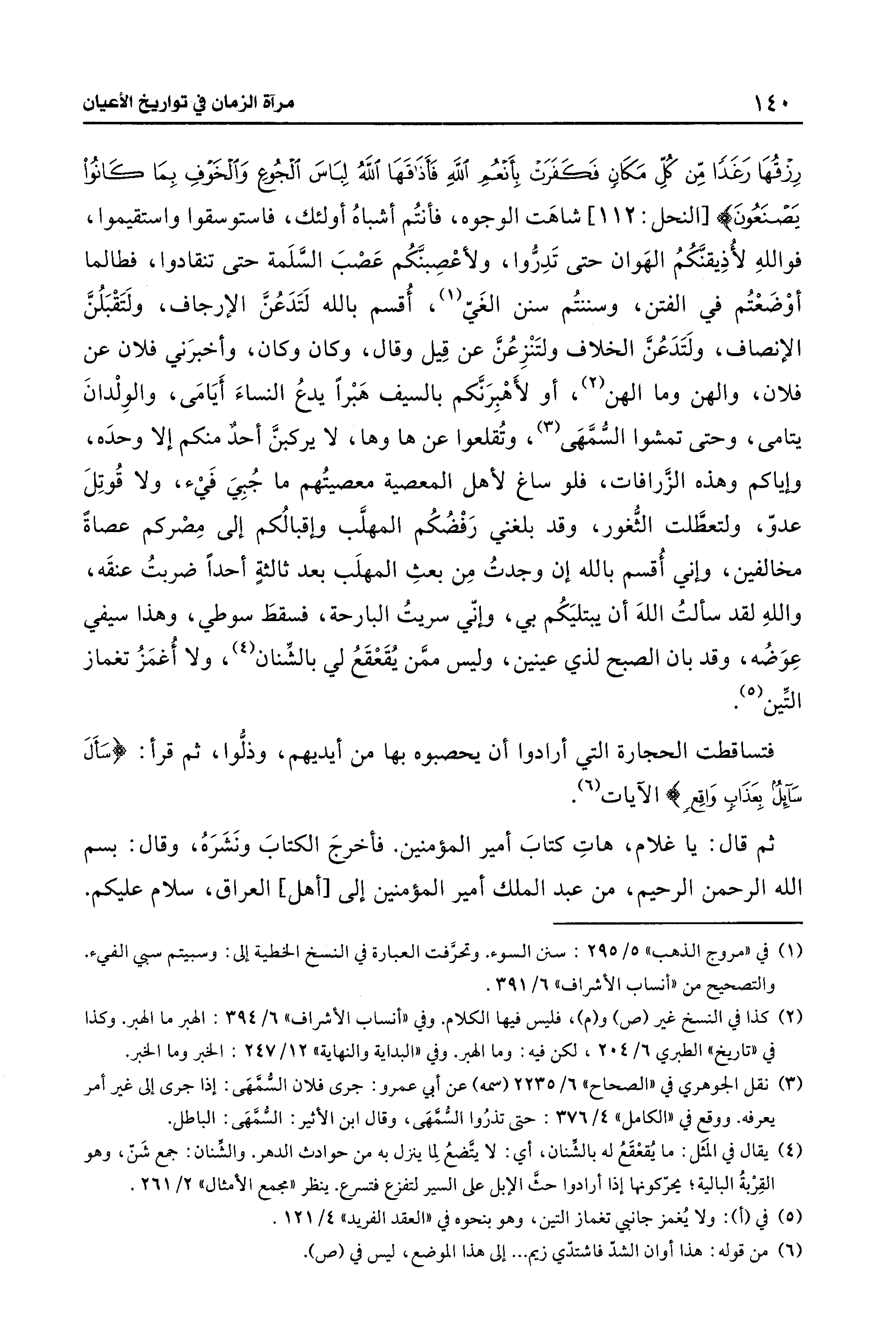ثم قال: يا غلام، هاتِ كتابَ أمير المؤمنين. فأخرجَ الكتابَ ونَشَرَهُ، وقال: بِسْمِ اللَّهِ الرَّحْمَنِ الرَّحِيمِ، من عبد الملك أمير المؤمنين إلى [أهل] العراق، سلام عليكم.