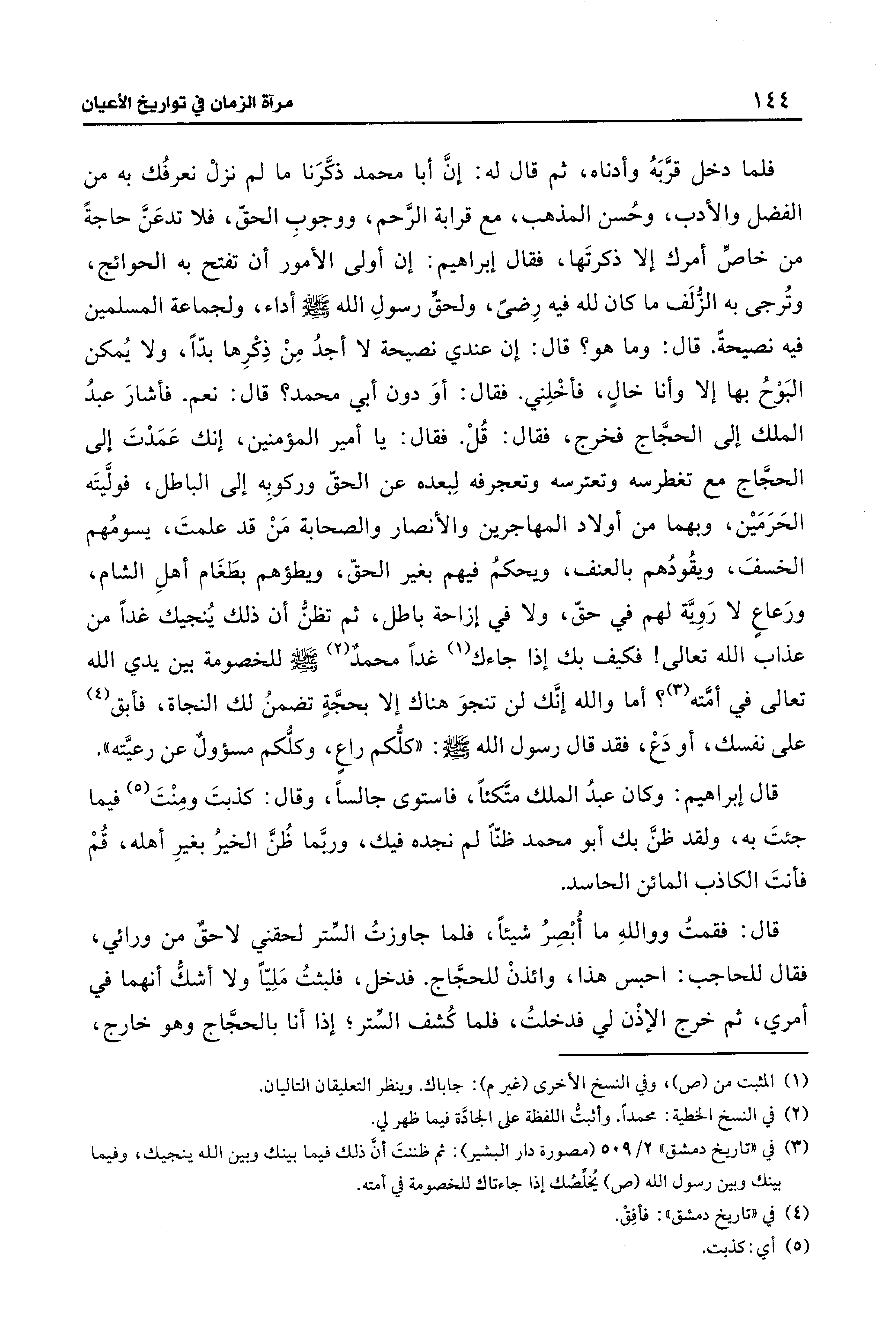 فلما دخل قرَّبَهُ وأدناه، ثم قال له: إنَّ أبا محمد ذكَّرَنا ما لم نزلْ نعرفُك به من الفضل والأدب، وحُسن المذهب، مع قرابة الرَّحم، ووجوبِ الحقّ، فلا تدعَنَّ حاجةً من خاصِّ أمرك إلا ذكرتَها، فقال إبراهيم: إن أولى الأمور أن تفتح به الحوائج، وتُرجى به الزّلَف ما كان لله فيه رِضي، ولحقِّ رسولِ الله - صلى الله عليه وسلم - أداء، ولجماعة المسلمين فيه نصيحة. قال: وما هو؟ قال: إن عندي نصيحة لا أجدُ مِنْ ذِكْرِها بدًّا، ولا يُمكن البَوْحُ بها إلا وأنا خالٍ، فأخْلِني. فقال: أوَ دون أبي محمد؟ قال: نعم. فأشارَ عبدُ الملك إلى الحجَّاج فخرج، فقال: قُلْ. فقال: يا أمير المؤمنين، إنك عَمَدْتَ إلى الحجَّاج مع تغطرسه وتعترسه وتعجرفه لِبعده عن الحقّ وركوبِه إلى الباطل، فولَّيتَه الحَرَمَين، وبهما من أولاد المهاجرين والأنصار والصحابة مَنْ قد علمتَ، يسومُهم الخسفَ، ويقُودُهم بالعنف، ويحكمُ فيهم بغير الحقّ، ويطؤهم بطَغَام أهلِ الشام، ورَعاع لا رَوِّيَة لهم في حقّ، ولا في إزاحة باطل، ثم تظن أن ذلك يُنجيك غدًا من عذاب الله تعالى! فكيف بك إذا جاءك (¬1) غدًا محمدٌ (¬2) - صلى الله عليه وسلم - للخصومة بين يدي الله تعالى في أمَّته (¬3)؟ أما والله إنَّك لن تنجوَ هناك إلا بحجَّةٍ تضمنُ لك النجاة، فأبق (¬4) على نفسك، أو دَعْ، فقد قال رسول الله - صلى الله عليه وسلم -: "كلّكم راع، وكلُّكم مسؤولٌ عن رعيَّته".