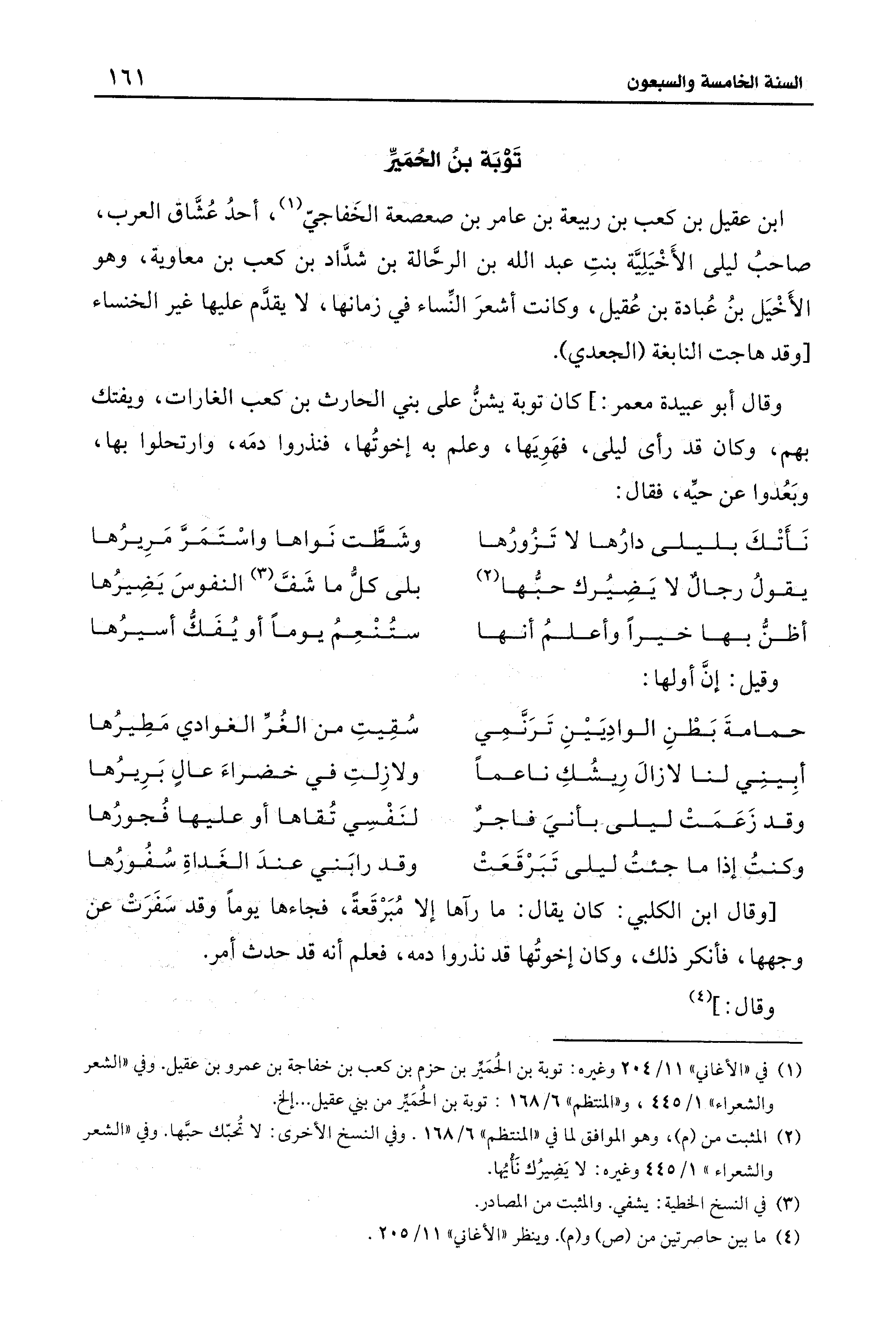 (¬1) في "الأغاني" 11/ 204 وغيره: توبة بن الحُمَيِّر بن حزم بن كعب بن خفاجة بن عمرو بن عقيل. وفي "الشعر والشعراء" 1/ 445، و"المنتظم" 6/ 168: توبة بن الحُمَير من بني عقيل ... إلخ.