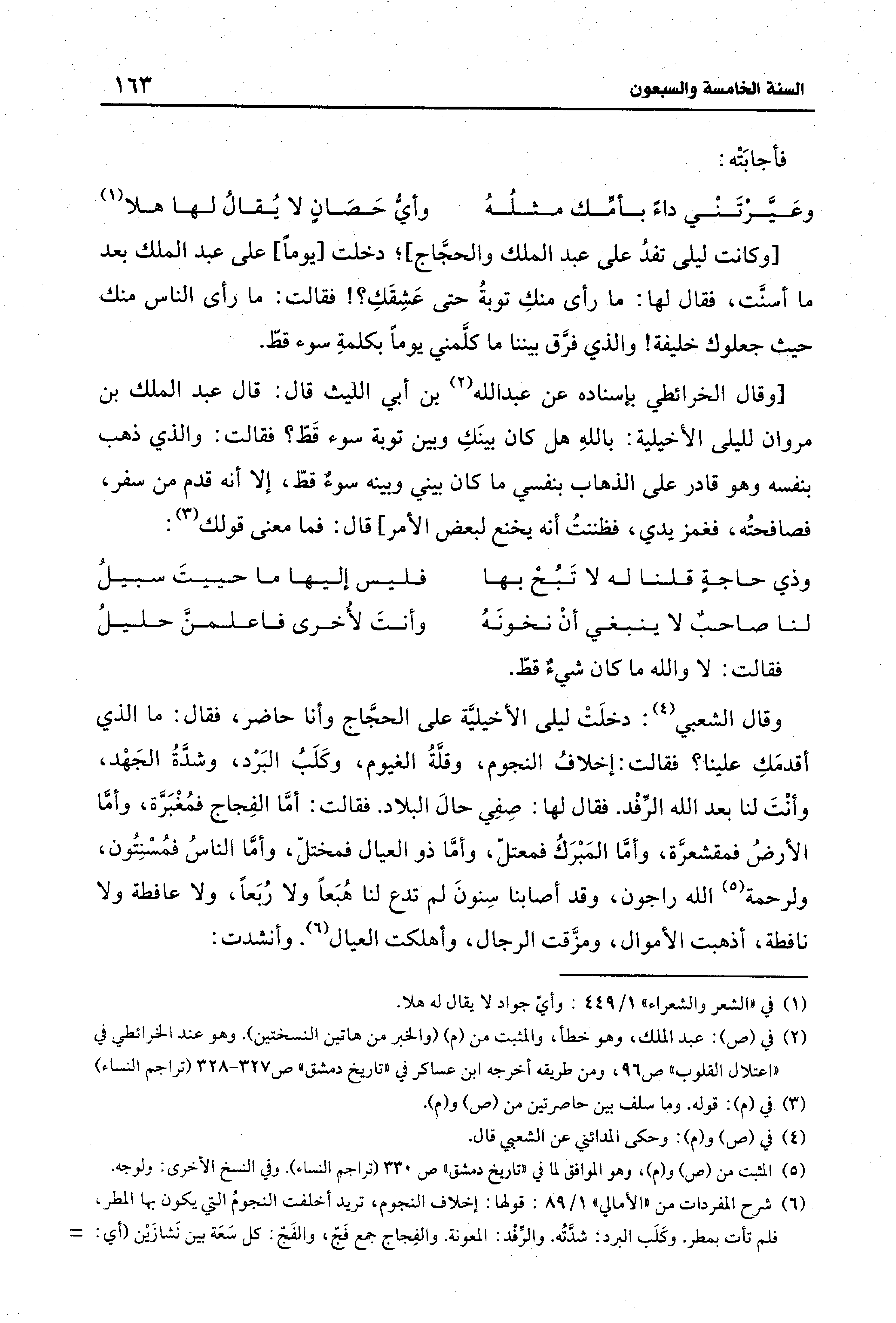 وقال الشعبي (¬4): دخلَتْ ليلى الأخيليَّة على الحجَّاج وأنا حاضر، فقال: ما الذي أقدمَكِ علينا؟ فقالت: إخلافُ النجوم، وقلَّةُ الغيوم، وكَلَبُ البَرْد، وشدَّةُ الجَهْد، وأنْتَ لنا بعد الله الرِّفْد. فقال لها: صِفِي حال البلاد. فقالت: أمَّا الفِجاج فمُغْبَرَّة، وأمَّا الأرضُ فمقشعرة، وأمَّا المَبْرَكُ فمعتلّ، وأمَّا ذو العيال فمختلّ، وأمَّا الناسُ فمُسْنِتُون، ولرحمة (¬5) الله راجون، وقد أصابنا سِنونَ لم تدع لنا هُبَعًا ولا رُبَعًا، ولا عافطة ولا نافطة، أذهبت الأموال، ومزَّقت الرجال، وأهلكت العيال (¬6). وأنشدت: