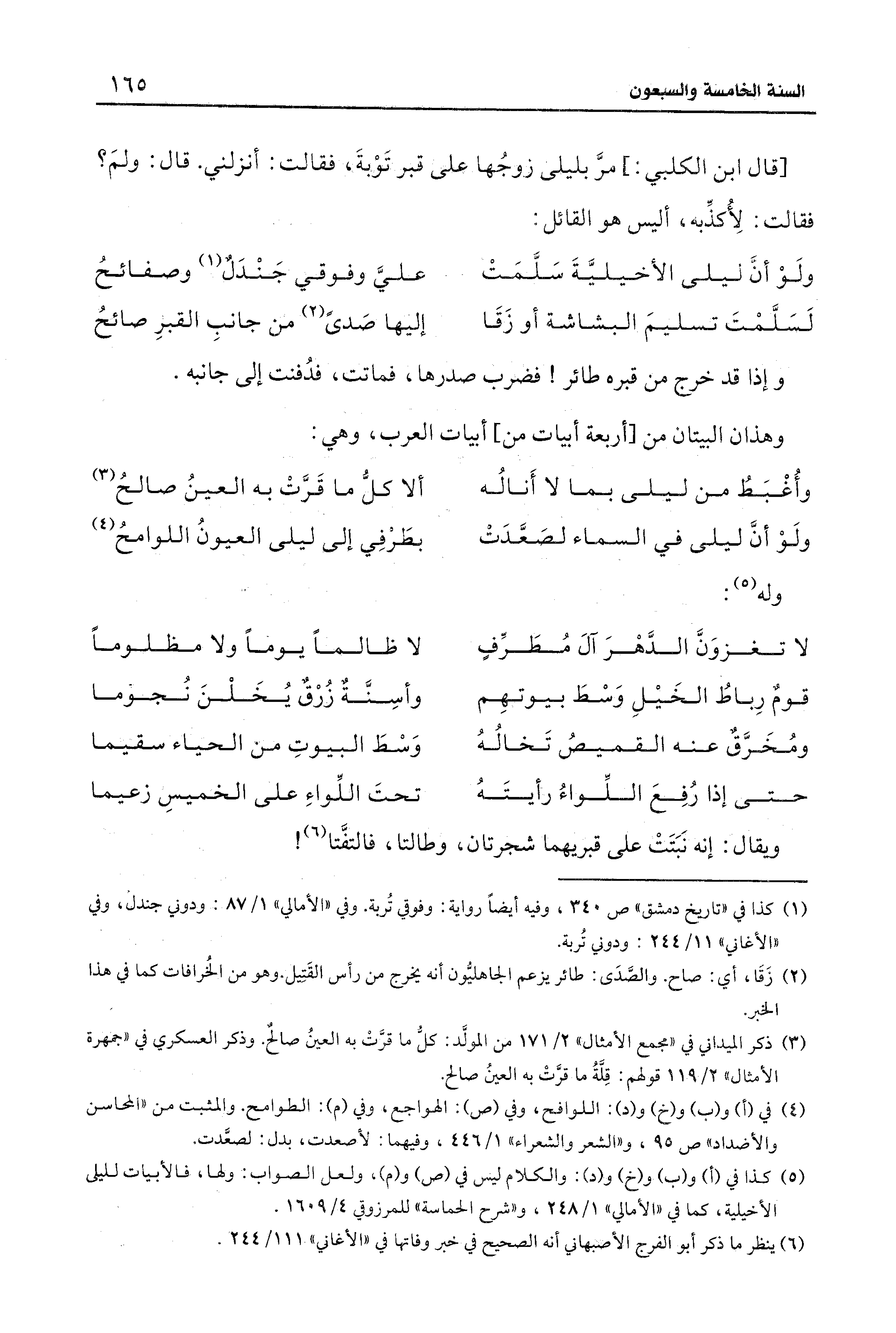 [قال ابن الكلبي.] مر بليلى زوجُها على قبر تَوْبةَ، فقالت: أنزلني. قال: ولمَ؟ فقالت: لِأُكذِّبه، أليس هو القائل: