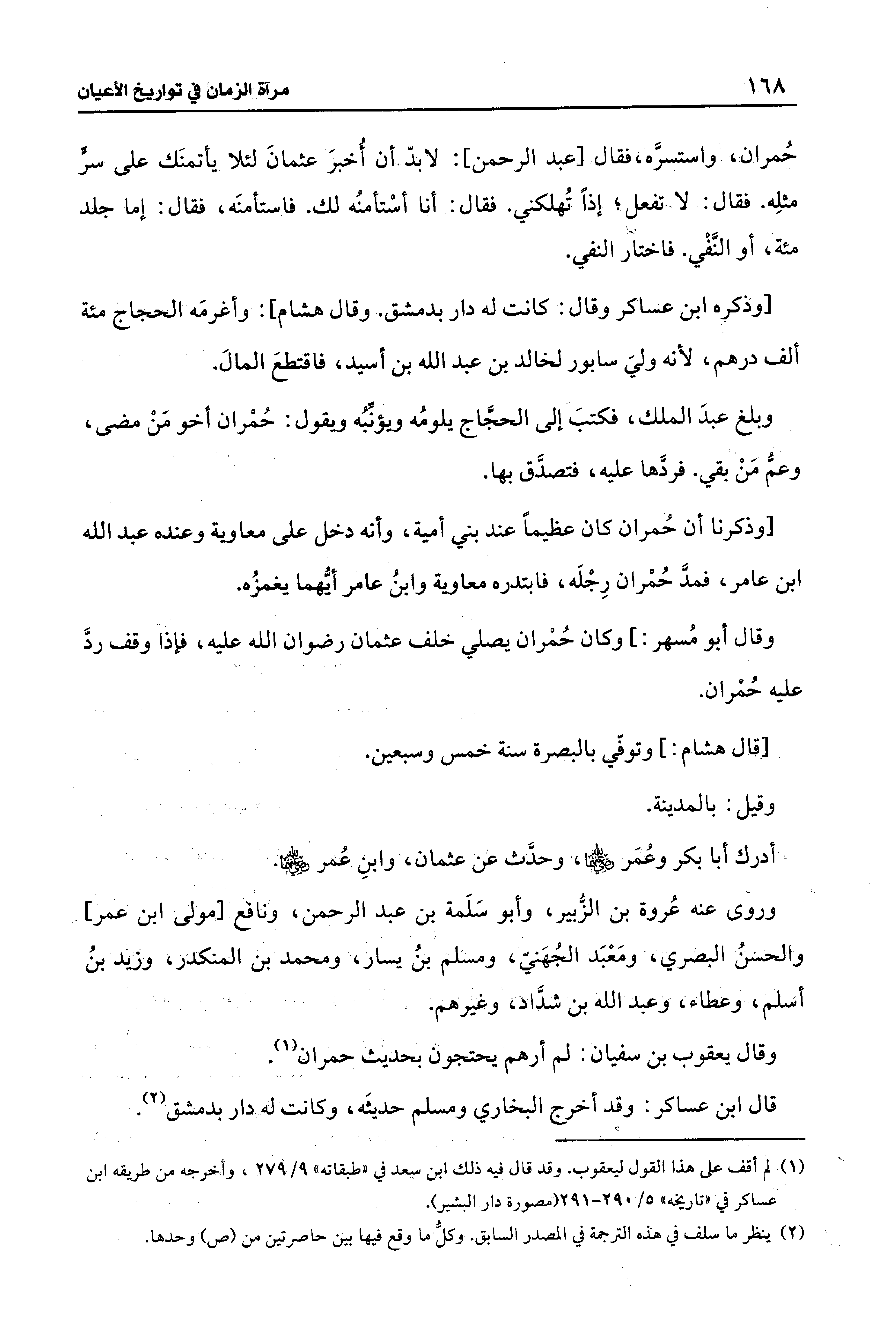[وذكرنا أن حُمران كان عظيمًا عند بني أمية، وأنه دخل على معاوية وعنده عبد الله بن عامر، فمدَّ حُمْران رِجْلَه، فابتدره معاوية وابنُ عامر أيهما يغمزُه.