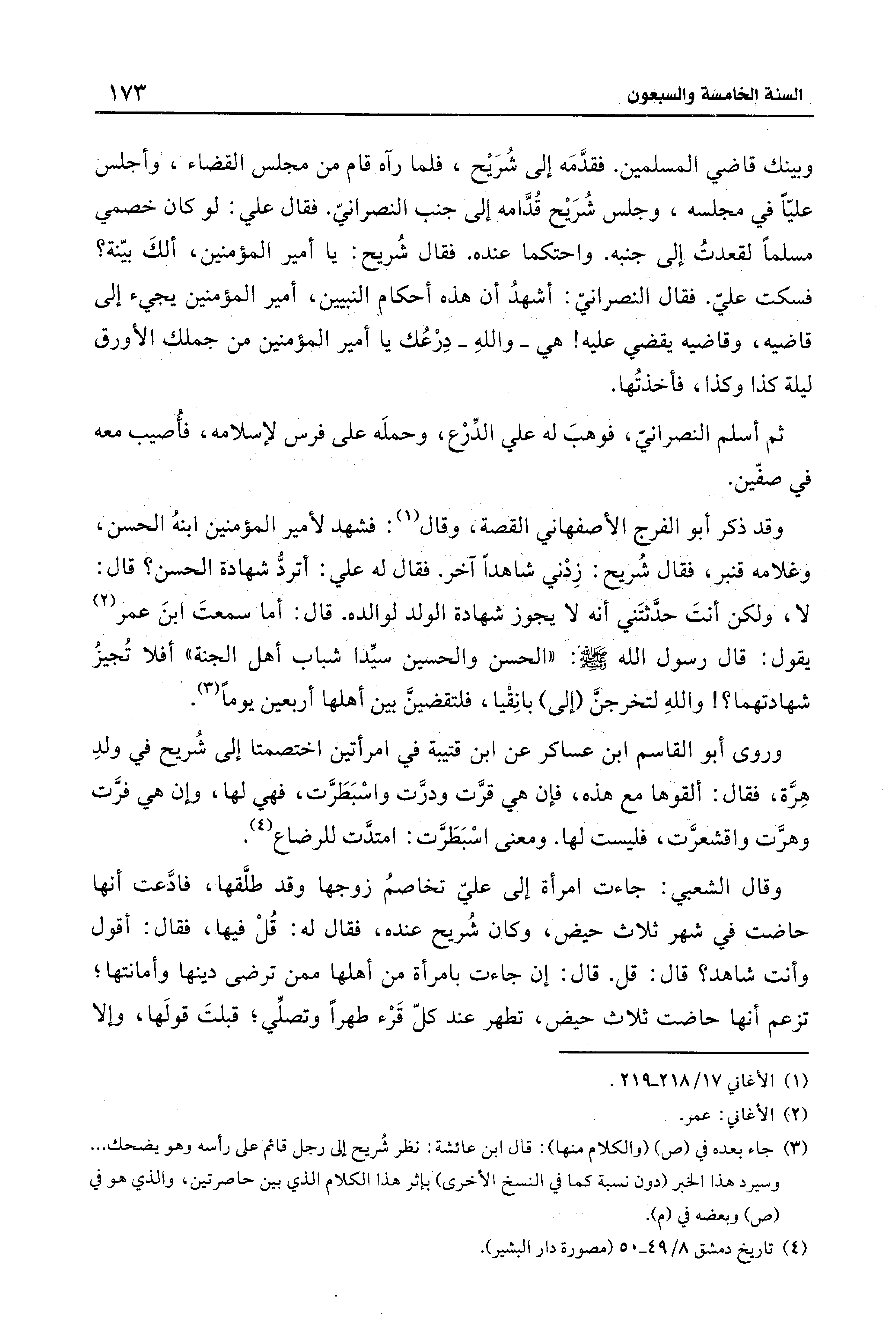 وبينك قاضي المسلمين. فقدَّمَه إلى شُرَيح، فلما رآه قام من مجلس القضاء، وأجلس عليًّا في مجلسه، وجلس شُرَيح قُدامه إلى جنب النصرانيّ. فقال علي: لو كان خصمي مسلمًا لقعدتُ إلى جنبه. واحتكما عنده. فقال شُريح: يا أمير المؤمنين، ألكَ بيّنة؟ فسكت عليّ. فقال النصرانيّ: أشهدُ أن هذه أحكام النبيين، أمير المؤمنين يجيء إلى قاضيه، وقاضيه يقضي عليه! هي -واللهِ- دِرْعُك يا أمير المؤمنين من جملك الأورق ليلة كذا وكذا، فأخذتُها.