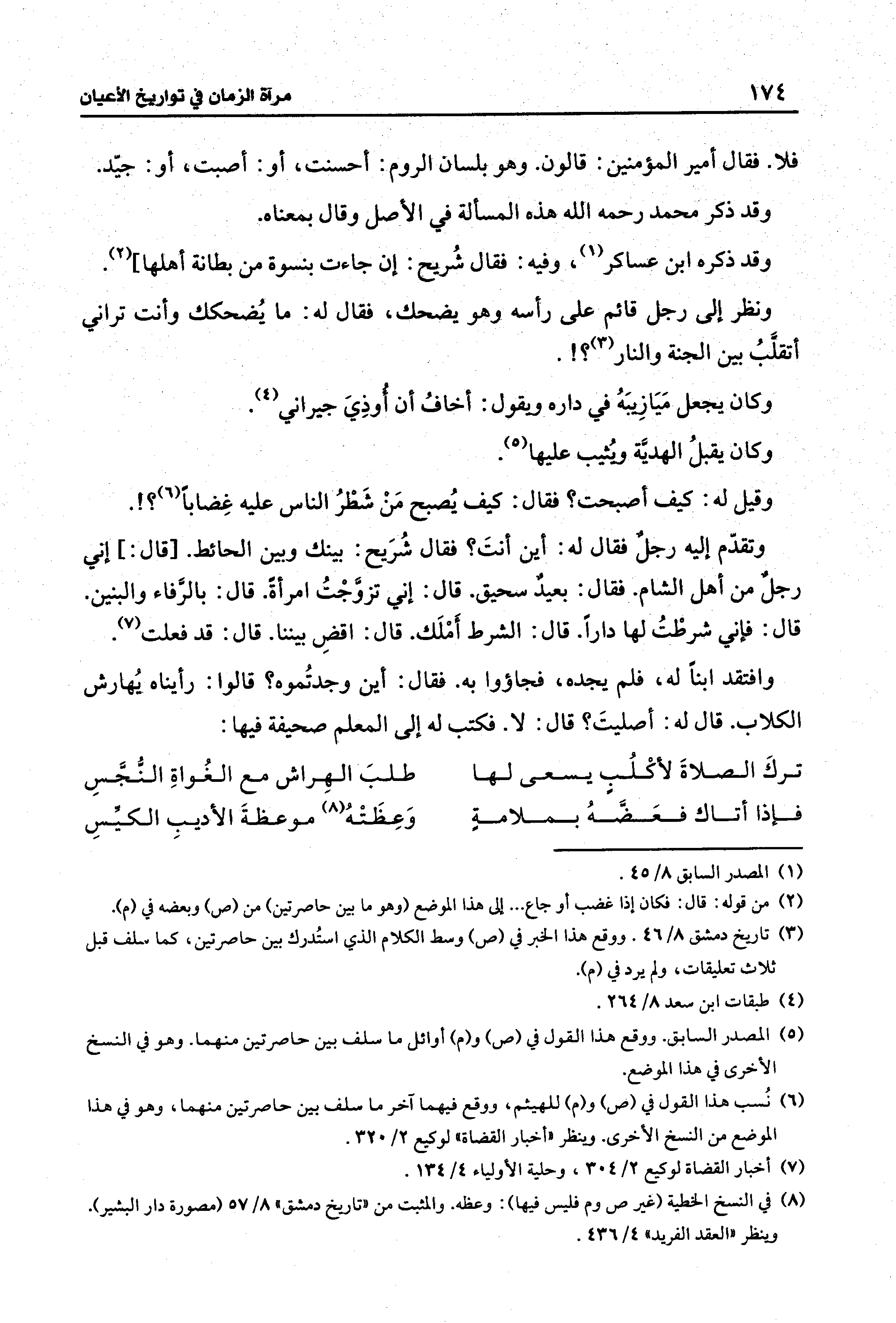 وتقدّم إليه رجلٌ فقال له: أين أنتَ؟ فقال شُرَيح: بينك وبين الحائط. [قال: ] إني رجل من أهل الشام. فقال: بعيدٌ سحيق. قال: إني تزوَّجْتُ امراة. قال: بالرفاء والبنين. قال: فإني شرطْتُ لها دارًا. قال: الشرط أمْلَك. قال: اقضِ بيننا. قال: قد فعلت (¬7).