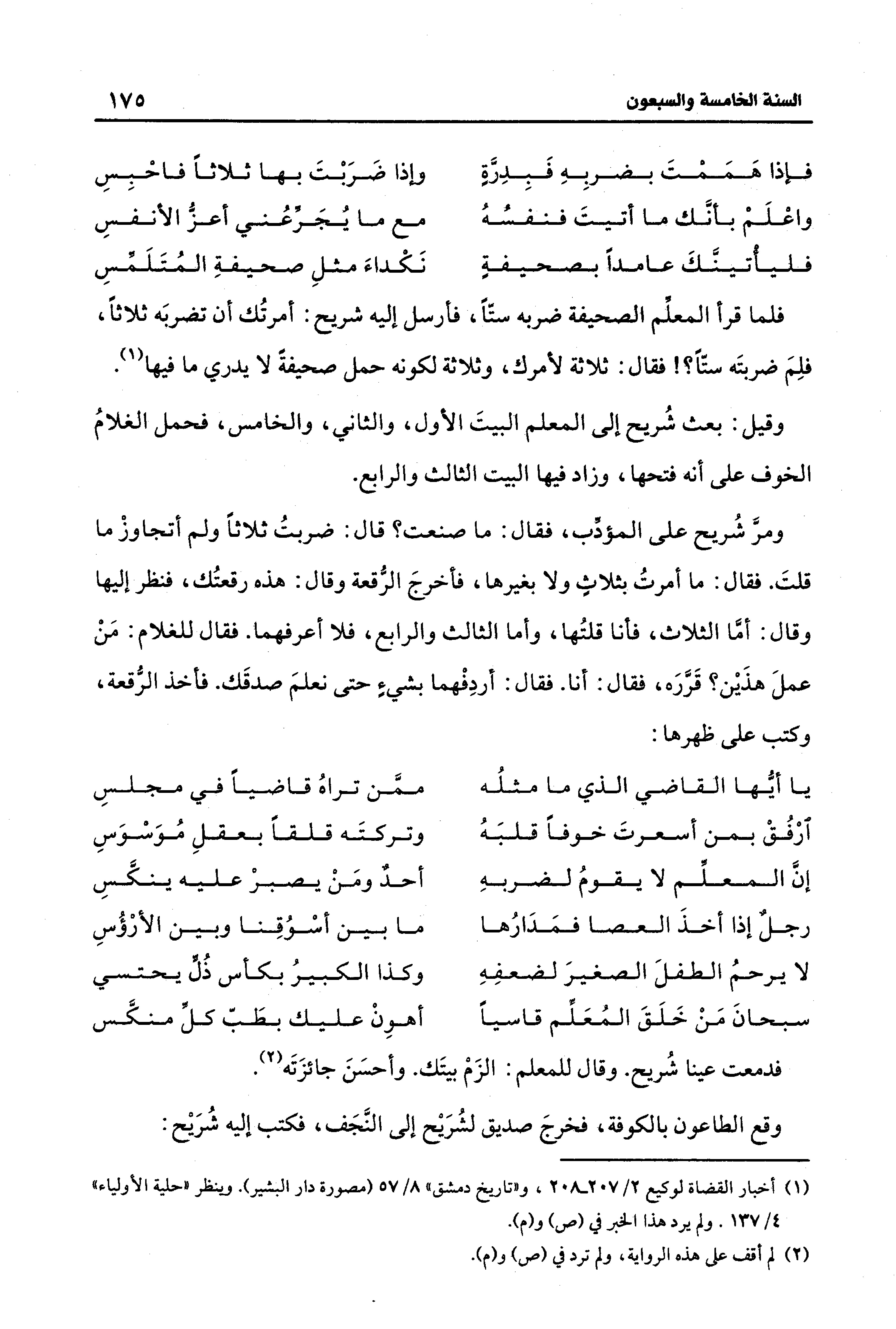 ومرَّ شُريح على المؤدِّب، فقال: ما صنعت؟ قال: ضربتُ ثلاثًا ولم أتجاوزْ ما قلتَ. فقال: ما أمرتُ بثلاثٍ ولا بغيرها، فأخرجَ الرقعة وقال: هذه رقعتُك، فنظر إليها وقال: أمَّا الثلاث، فأنا قلتُها، وأما الثالث والرابع، فلا أعرفهما. فقال للغلام: مَنْ عملَ هذَين؟ قَررَه، فقال: أنا. فقال: أردِفْهما بشيءٍ حتى نعلمَ صدقَك. فأخذ الرقعة، وكتب على ظهرها: