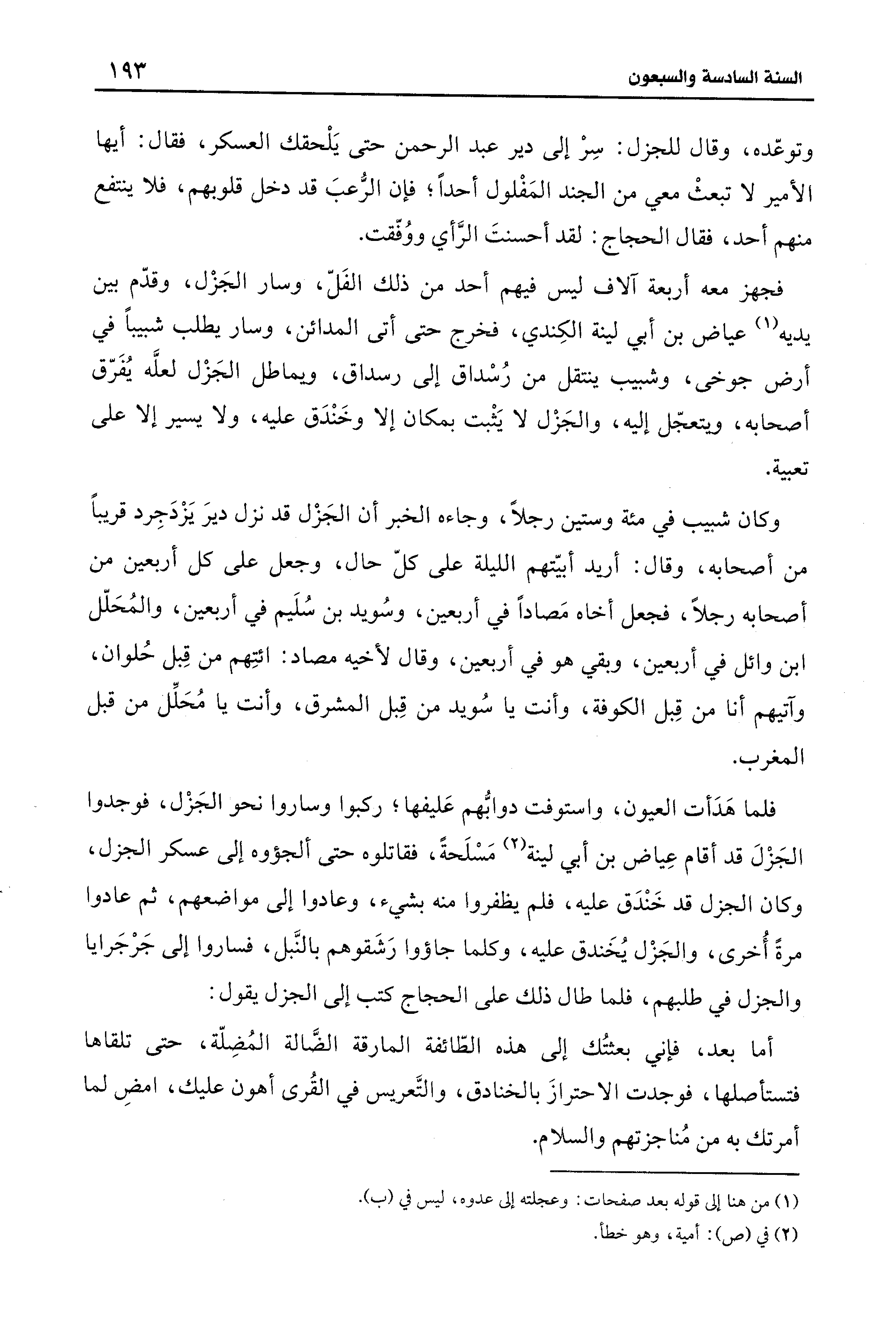 وتوعّده، وقال للجزل: سِرْ إلى دير عبد الرحمن حتى يَلْحقك العسكر، فقال: أيها الأمير لا تبعثْ معي من الجند المَفْلول أحدًا؛ فإن الرُّعب قد دخل قلوبهم، فلا ينتفع منهم أحد، فقال الحجاج: لقد أحسنتَ الرَّأي ووُفّقت.