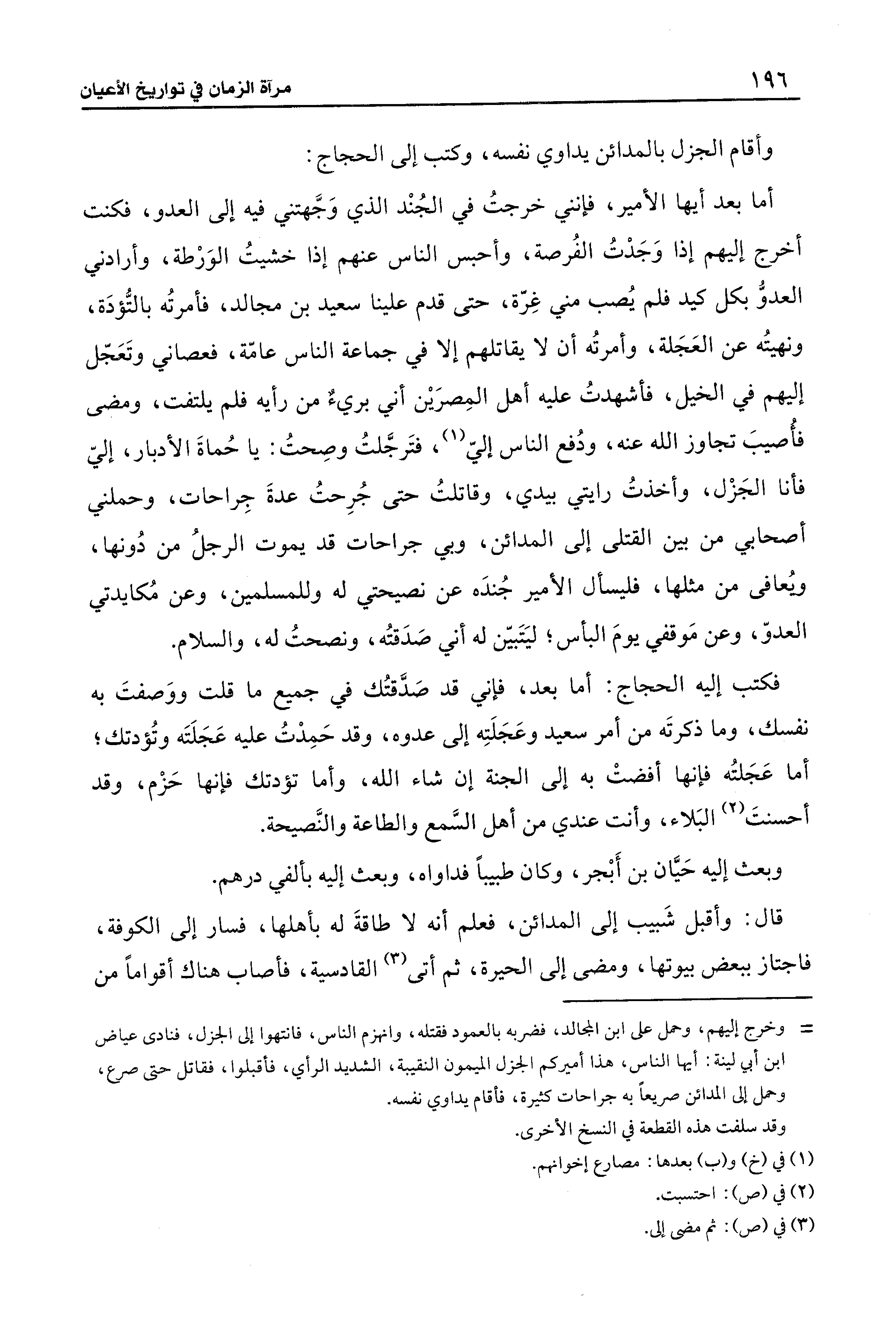 أما بعد أيها الأمير، فإنني خرجتُ في الجُنْد الذي وَجَّهتني فيه إلى العدو، فكنت أخرج إليهم إذا وَجَدْتُ الفُرصة، وأحبس الناس عنهم إذا خشيتُ الوَرْطة، وأرادني العدوُّ بكل كيد فلم يُصب مني غِرّة، حتى قدم علينا سعيد بن مجالد، فأمرتُه بالتُّؤدَة، ونهيتُه عن العَجَلة، وأمرتُه أن لا يقاتلهم إلا في جماعة الناس عامّة، فعصاني وتَعَجّل إليهم في الخيل، فأشهدتُ عليه أهل المِصرَين أني بريءٌ من رأيه فلم يلتفت، ومضى فأُصيبَ تجاوز الله عنه، ودُفع الناس إليّ (¬1)، فتَرجَّلتُ وصِحتُ: يا حُماةَ الأدبار، إليّ فأنا الجَزْل، وأخذتُ رايتي بيدي، وقاتلتُ حتى جُرِحتُ عدةَ جِراحات، وحملني أصحابي من بين القتلى إلى المدائن، وبي جراحات قد يموت الرجلُ من دُونها، ويُعافى من مثلها، فليسأل الأمير جُندَه عن نصيحتي له وللمسلمين، وعن مُكايدتي العدوّ، وعن مَوقفي يومَ البأس؛ ليَتَبيّن له أني صَدَقتُه، ونصحتُ له، والسلام.