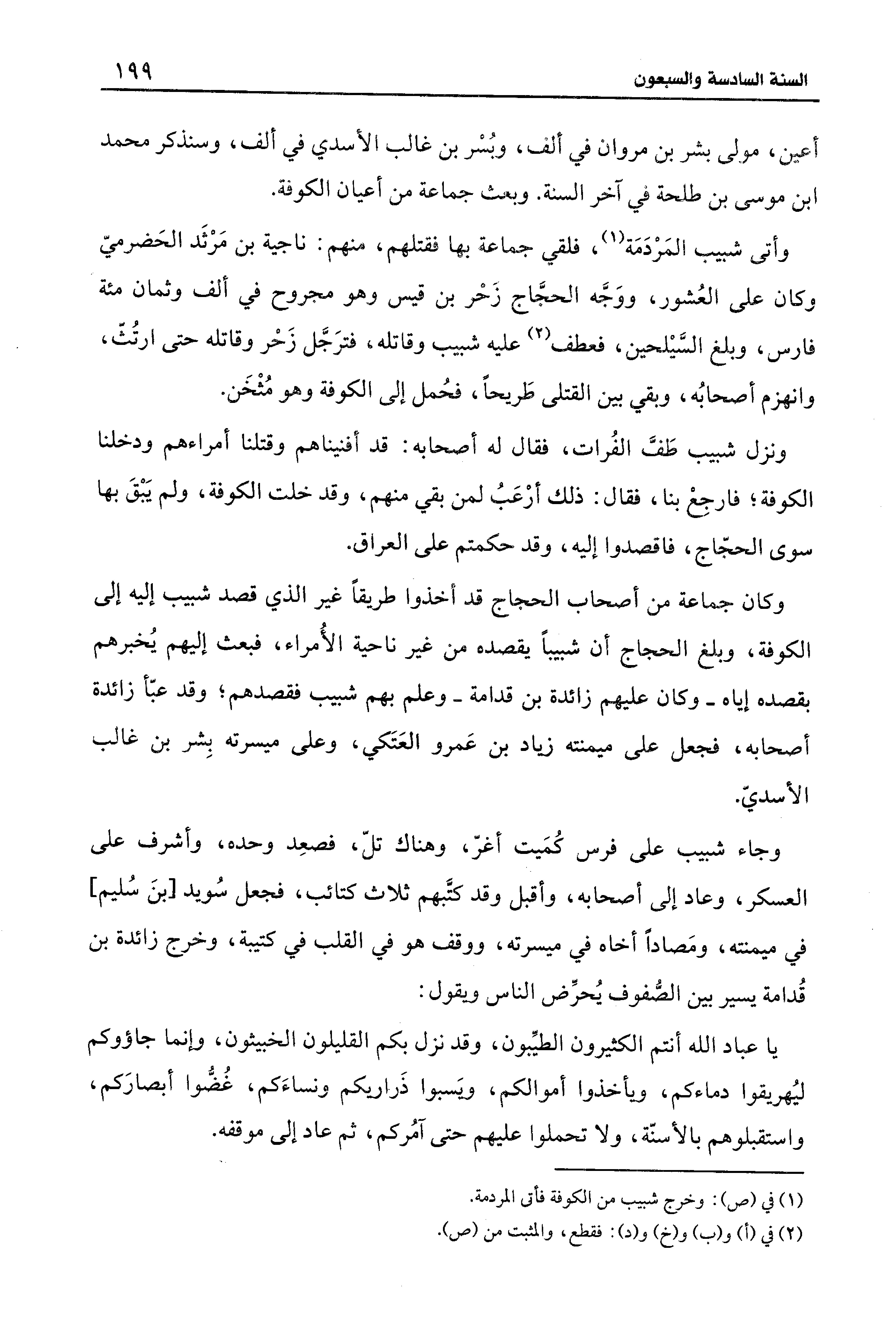 وأتى شبيب المَرْدَمَة (¬1)، فلقي جماعة بها فقتلهم، منهم: ناجية بن مَرْثَد الحَضرميّ وكان على العُشور، ووَجَّه الحجَّاج زَخر بن قيس وهو مجروح في ألف وثمان مئة فارس، وبلغ السَّيلحين، فعطف (¬2) عليه شبيب وقاتله, فترَجَّل زَحْر وقاتله حتى ارتُثّ، وانهزم أصحابُه، وبقي بين القتلى طَريحًا، فحُمل إلى الكوفة وهو مُثخَن.