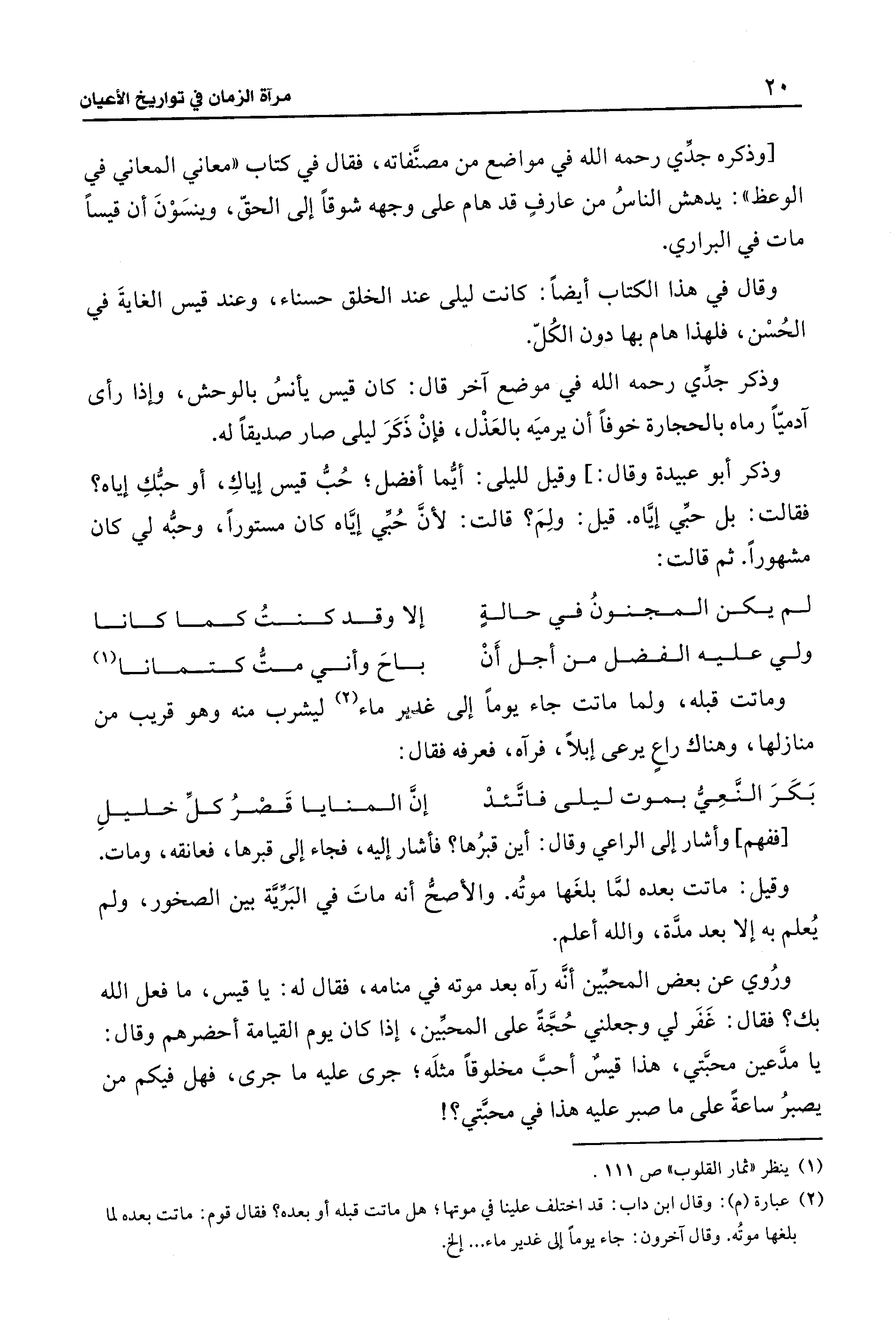 وذكر جدِّي رحمه الله في موضع آخر قال: كان قيس يأنسُ بالوحش، وإذا رأى آدميًّا رماه بالحجارة خوفًا أن يرميَه بالعَذْل، فإنْ ذَكَرَ ليلى صار صديقًا له.
