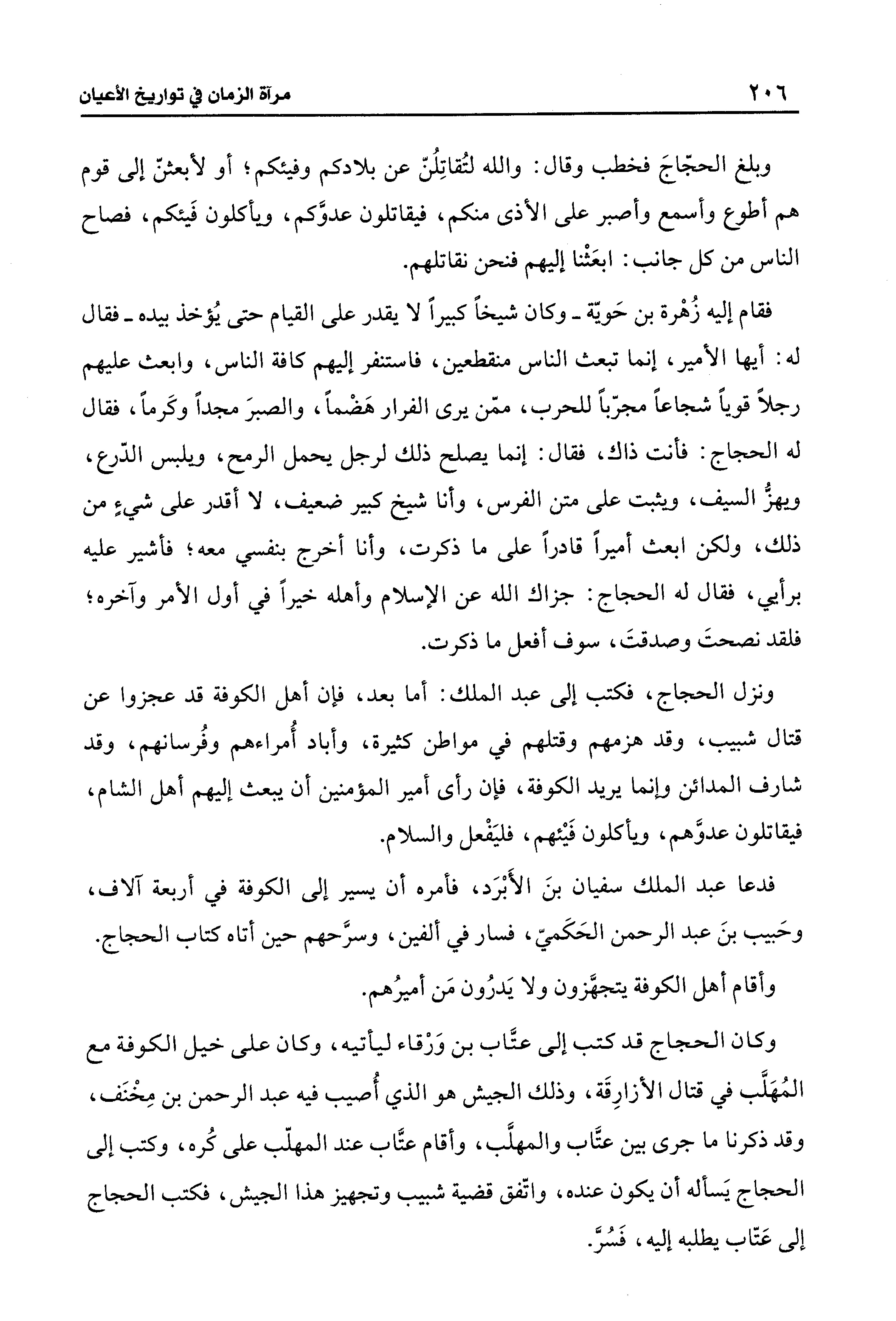 وبلغ الحجّاجَ فخطب وقال: والله لتُقاتِلُنّ عن بلادكم وفيئكم؛ أو لأبعثنّ إلى قوم هم أطوع وأسمع وأصبر على الأذى منكم، فيقاتلون عدوَّكم، ويأكلون فَيئكم، فصاح الناس من كل جانب: ابعَثْنا إليهم فنحن نقاتلهم.