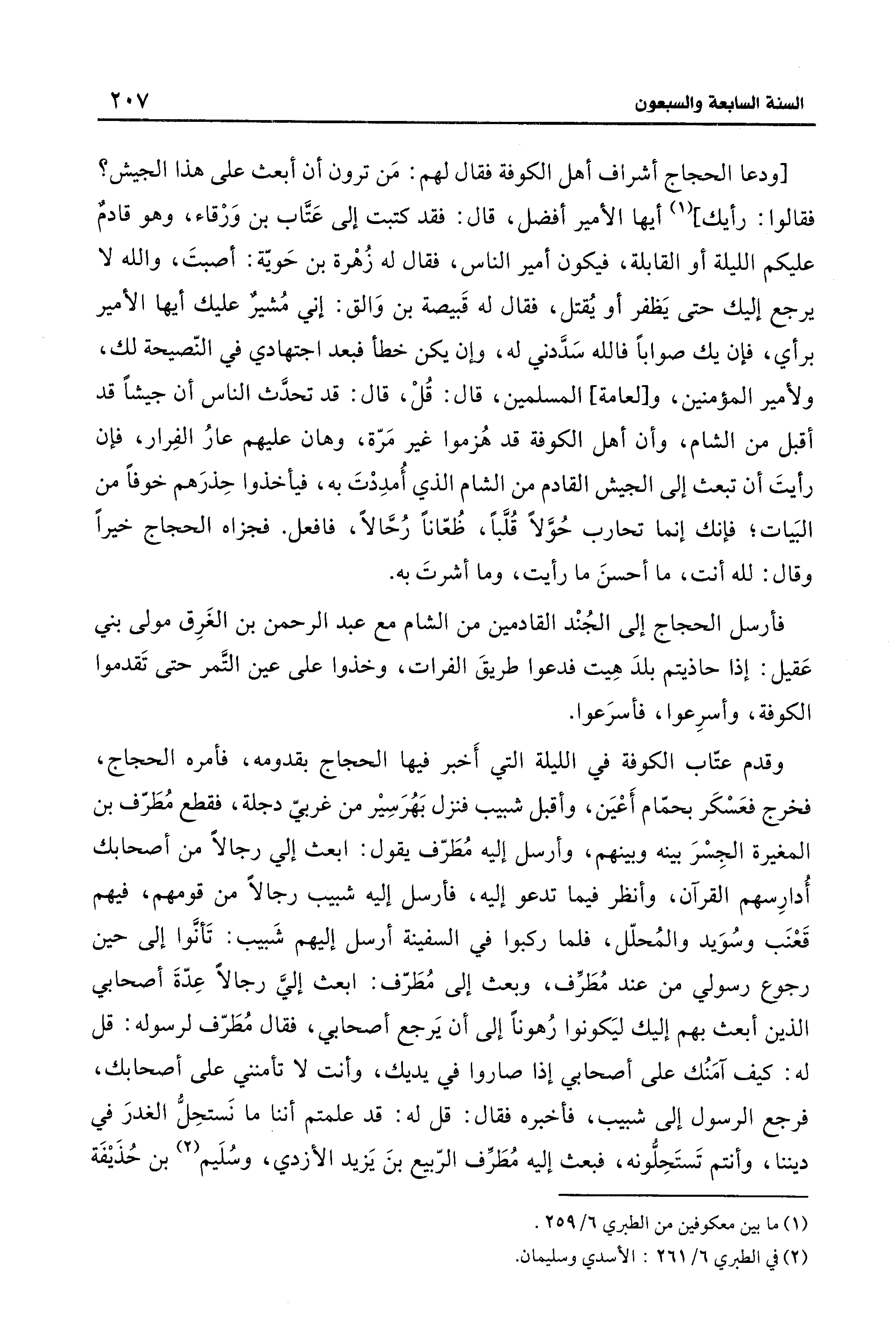 [ودعا الحجاج أشراف أهل الكوفة فقال لهم: مَن ترون أن أبعث على هذا الجيش؟ فقالوا: رأيك] (¬1) أيها الأمير أفضل، قال: فقد كتبت إلى عَتَّاب بن وَرْقاء، وهو قادمٌ عليكم الليلة أو القابلة، فيكون أمير الناس، فقال له زُهْرة بن حَويّة: أصبتَ، والله لا يرجع إليك حتى يَظفر أو يُقتل، فقال له قَبيصة بن وَالق: إني مُشيرٌ عليك أيها الأمير برأي، فإن يك صوابًا فالله سَدَّدني له، وإن يكن خطأ فبعد اجتهادي في النّصيحة لك، ولأمير المؤمنين، و [لعامة] المسلمين، قال: قُلْ، قال: قد تحدَّث الناس أن جيشًا قد أقبل من الشام، وأن أهل الكوفة قد هُزموا غير مَرّة، وهان عليهم عارُ الفِرار، فإن رأيتَ أن تبعث إلى الجيش القادم من الشام الذي أُمدِدْتَ به، فيأخذوا حِذرَهم خوفًا من البَيات؛ فإنك إنما تحارب حُوَّلًا قُلَّبًا، ظُعّانًا رُحَّالًا، فافعل. فجزاه الحجاج خيرًا وقال: لله أنت، ما أحسنَ ما رأيت، وما أشرتَ به.