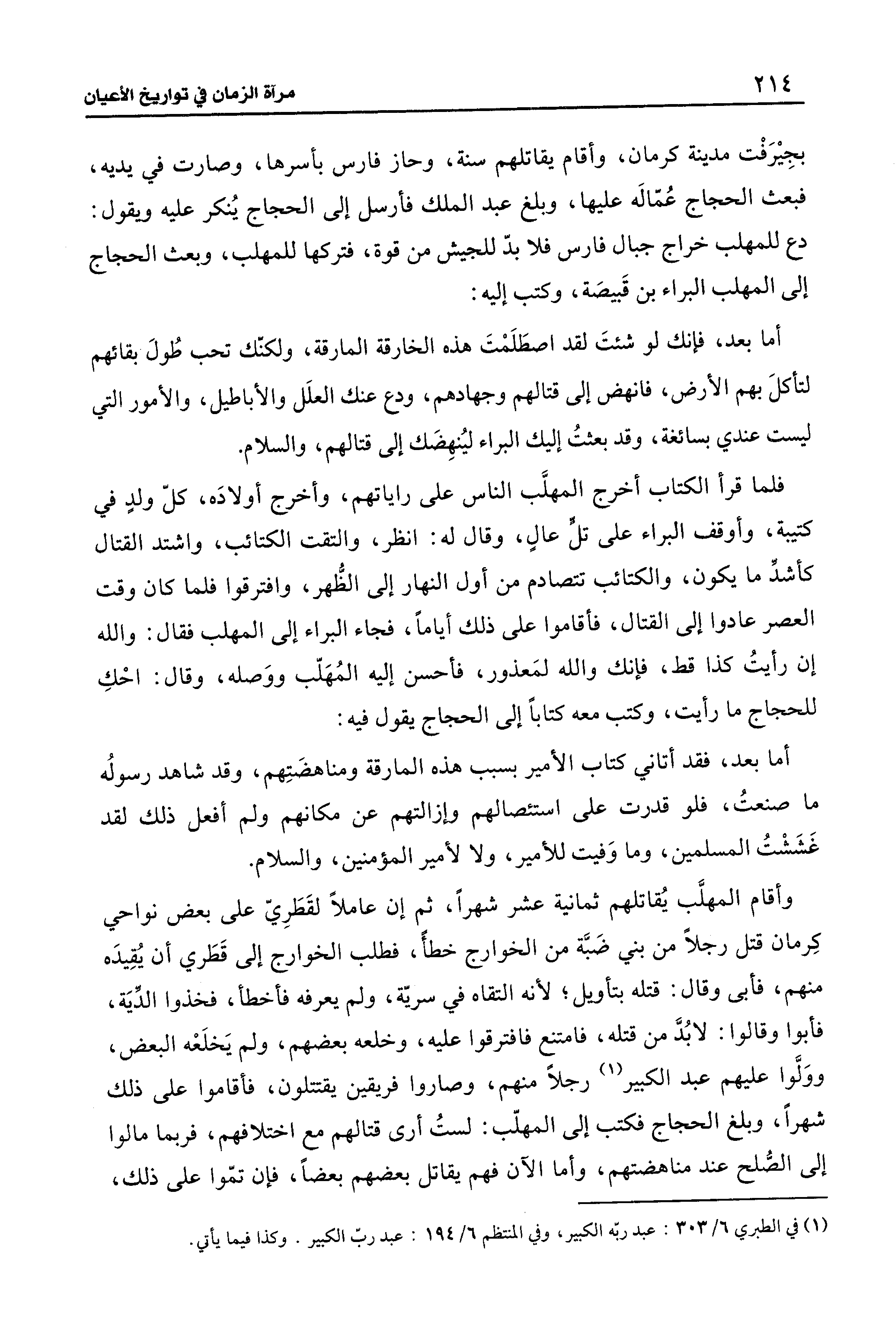 فلما قرأ الكتاب أخرج المهلَّب الناس على راياتهم، وأخرج أولادَه، كلّ ولدٍ في كتيبة، وأوقف البراء على تلٍّ عالٍ، وقال له: انظر، والتقت الكتائب، واشتد القتال كأشدِّ ما يكون، والكتائب تتصادم من أول النهار إلى الظُّهر، وافترقوا فلما كان وقت العصر عادوا إلى القتال، فأقاموا على ذلك أيامًا، فجاء البراء إلى المهلب فقال: والله إن رأيتُ كذا قط، فإنك والله لمَعذور، فأحسن إليه المُهَلّب ووَصله، وقال: احْكِ للحجاج ما رأيت، وكتب معه كتابًا إلى الحجاج يقول فيه: