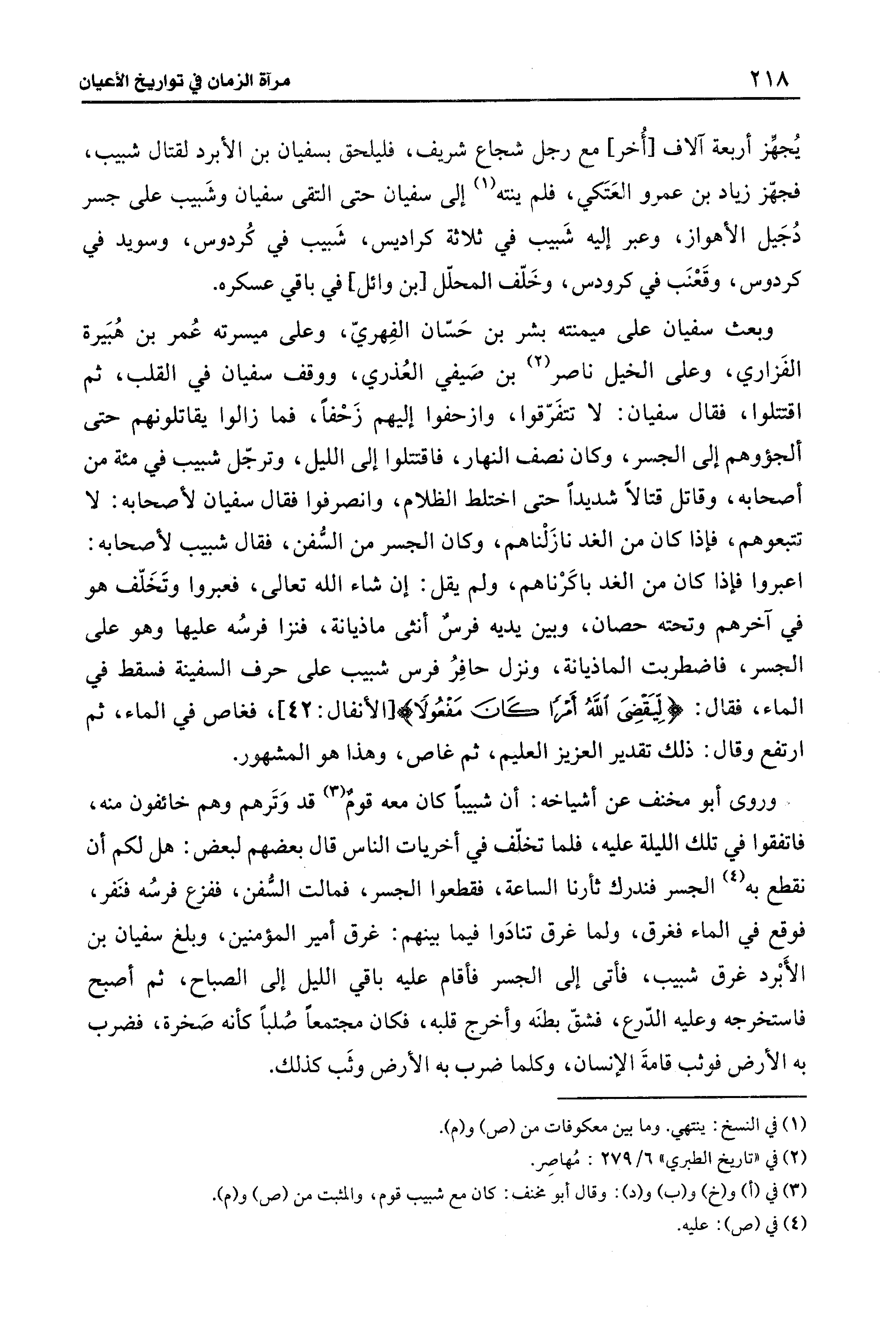 وبعث سفيان على ميمنته بشر بن حَسّان الفِهريّ، وعلى ميسرته عُمر بن هُبَيرة الفَزاري، وعلى الخيل ناصر (¬2) بن صَيفي العُذري، ووقف سفيان في القلب، ثم اقتتلوا، فقال سفيان: لا تتفَرّقوا، وازحفوا إليهم زَحْفًا، فما زالوا يقاتلونهم حتى ألجؤوهم إلى الجسر، وكان نصف النهار، فاقتتلوا إلى الليل، وترجّل شبيب في مئة من أصحابه، وقاتل قتالًا شديدًا حتى اختلط الظلام، وانصرفوا فقال سفيان لأصحابه: لا تتبعوهم, فإذا كان من الغد نازَلْناهم، وكان الجسر من السُّفن، فقال شبيب لأصحابه: اعبروا فإذا كان من الغد باكَرْناهم، ولم يقل: إن شاء الله تعالى، فعبروا وتَخَلّف هو في آخرهم وتحته حصان، وبين يديه فرسٌ أنثى ماذيانة، فنزا فرسُه عليها وهو على الجسر، فاضطربت الماذيانة، ونزل حافِرُ فرس شبيب على حرف السفينة فسقط في الماء، فقال: {لِيَقْضِيَ اللَّهُ أَمْرًا كَانَ مَفْعُولًا} [الأنفال: 42]، فغاص في الماء، ثم ارتفع وقال: ذلك تقدير العزيز العليم، ثم غاص، وهذا هو المشهور.