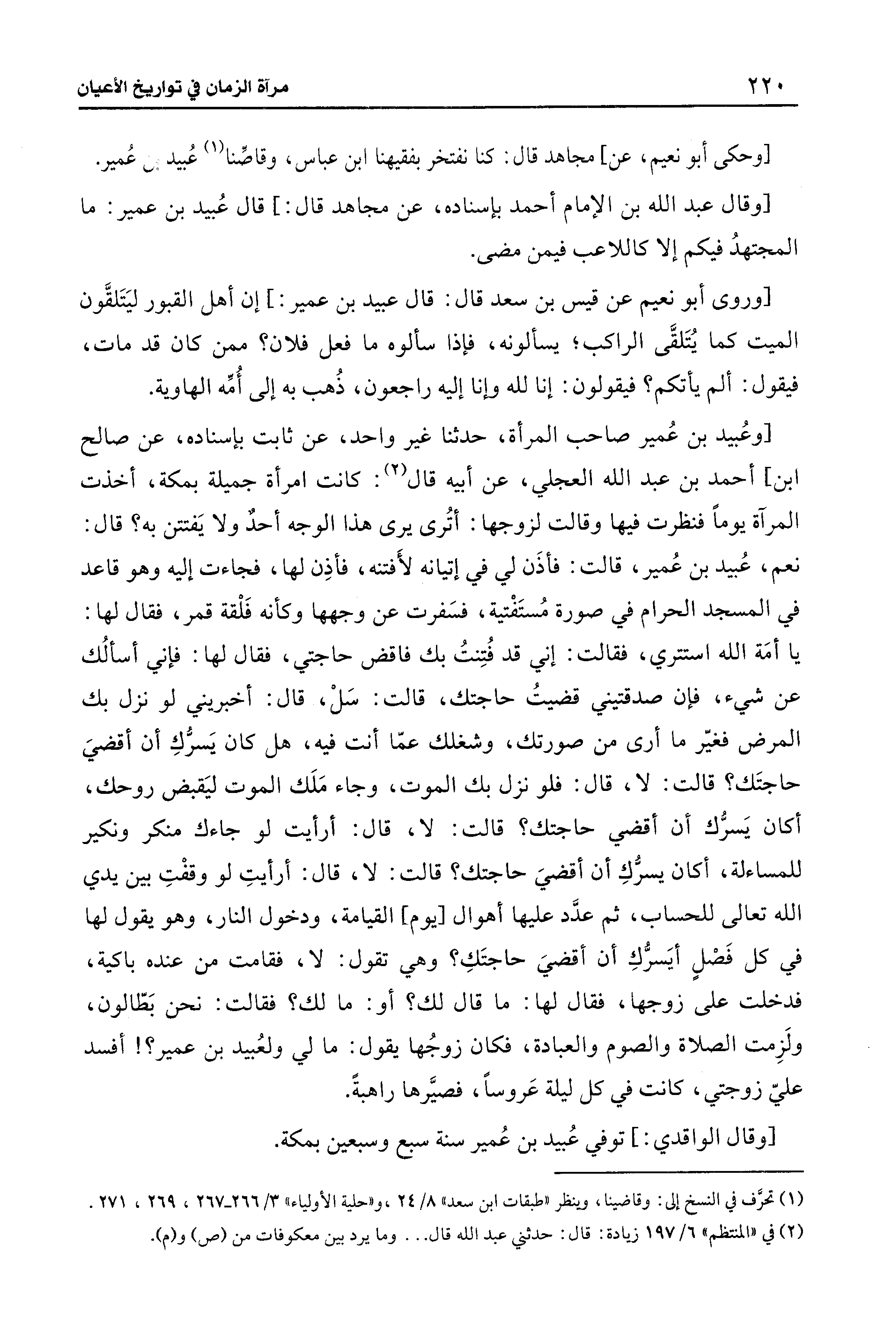 [وعُبيد بن عُمير صاحب المرأة، حدثنا غير واحد، عن ثابت بإسناده، عن صالح ابن] أحمد بن عبد الله العجلي، عن أبيه قال (¬2): كانت امرأة جميلة بمكة، أخذت المرآة يومًا فَنظرت فيها وقالت لزوجها: أتُرى يرى هذا الوجه أحدٌ ولا يَفتتن به؟ قال: نعم، عُبيد بن عُمير، قالت: فأذَن لي في إتيانه لأَفتنه، فأذِن لها، فجاءت إليه وهو قاعد في المسجد الحرام في صورة مُستَفْتية، فسَفرت عن وجهها وكأنه فَلْقة قمر، فقال لها: يا أمَة الله استتري، فقالت: إني قد فُتِنتُ بك فاقض حاجتي، فقال لها: فإني أسألُك عن شيء، فإن صدقتيني قضيتُ حاجتك، قالت: سَلْ، قال: أخبريني لو نزل بك المرض فغيّر ما أرى من صورتك، وشغلك عمّا أنت فيه، هل كان يَسرُّكِ أن أقضيَ حاجتَك؟ قالت: لا، قال: فلو نزل بك الموت، وجاء مَلَك الموت ليَقبض روحك، أكان يَسرُّك أن أقضي حاجتك؟ قالت: لا، قال: أرأيت لو جاءك منكر ونكير للمساءلة، أكان يسرُّكِ أن أقضيَ حاجتك؟ قالت: لا، قال: أرأيتِ لو وقفْتِ بين يدي الله تعالى للحساب، ثم عدَّد عليها أهوال [يوم] القيامة، ودخول النار، وهو يقول لها في كل فَصْلٍ أيَسرُّكِ أن أقضيَ حاجتَكِ؟ وهي تقول: لا، فقامت من عنده باكية، فدخلت على زوجها، فقال لها: ما قال لك؟ أو: ما لك؟ فقالت: نحن بَطّالون، ولَزِمت الصلاة والصوم والعبادة، فكان زوجُها يقول: ما لي ولعُبيد بن عمير؟ ! أفسد عليّ زوجتي، كانت في كل ليلة عَروسًا، فصيَّرها راهبةً.