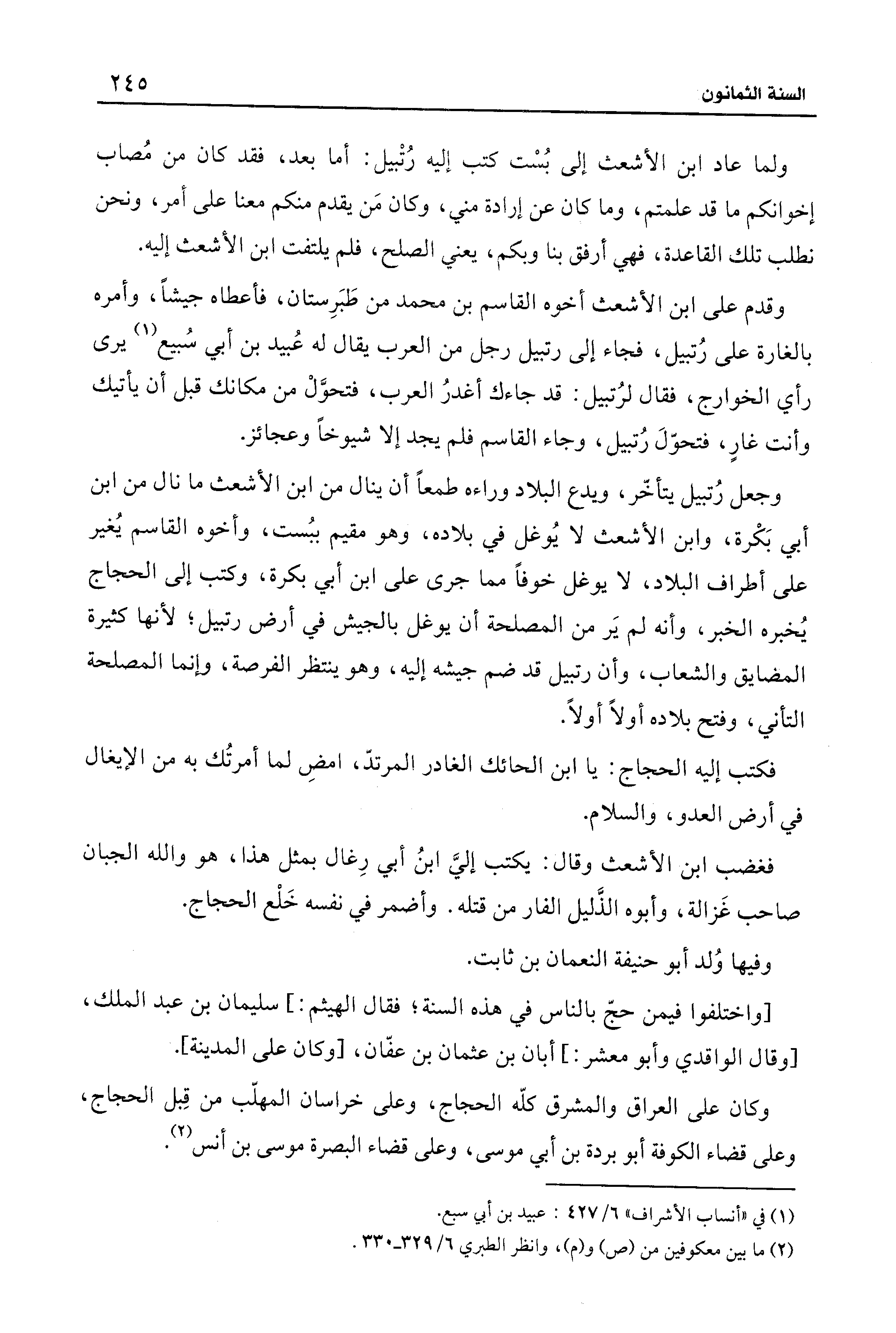 وكان على العراق والمشرق كلّه الحجاج، وعلى خراسان المهلّب من قِبل الحجاج، وعلى قضاء الكوفة أبو بردة بن أبي موسى، وعلى قضاء البصرة موسى بن أنس (¬2).