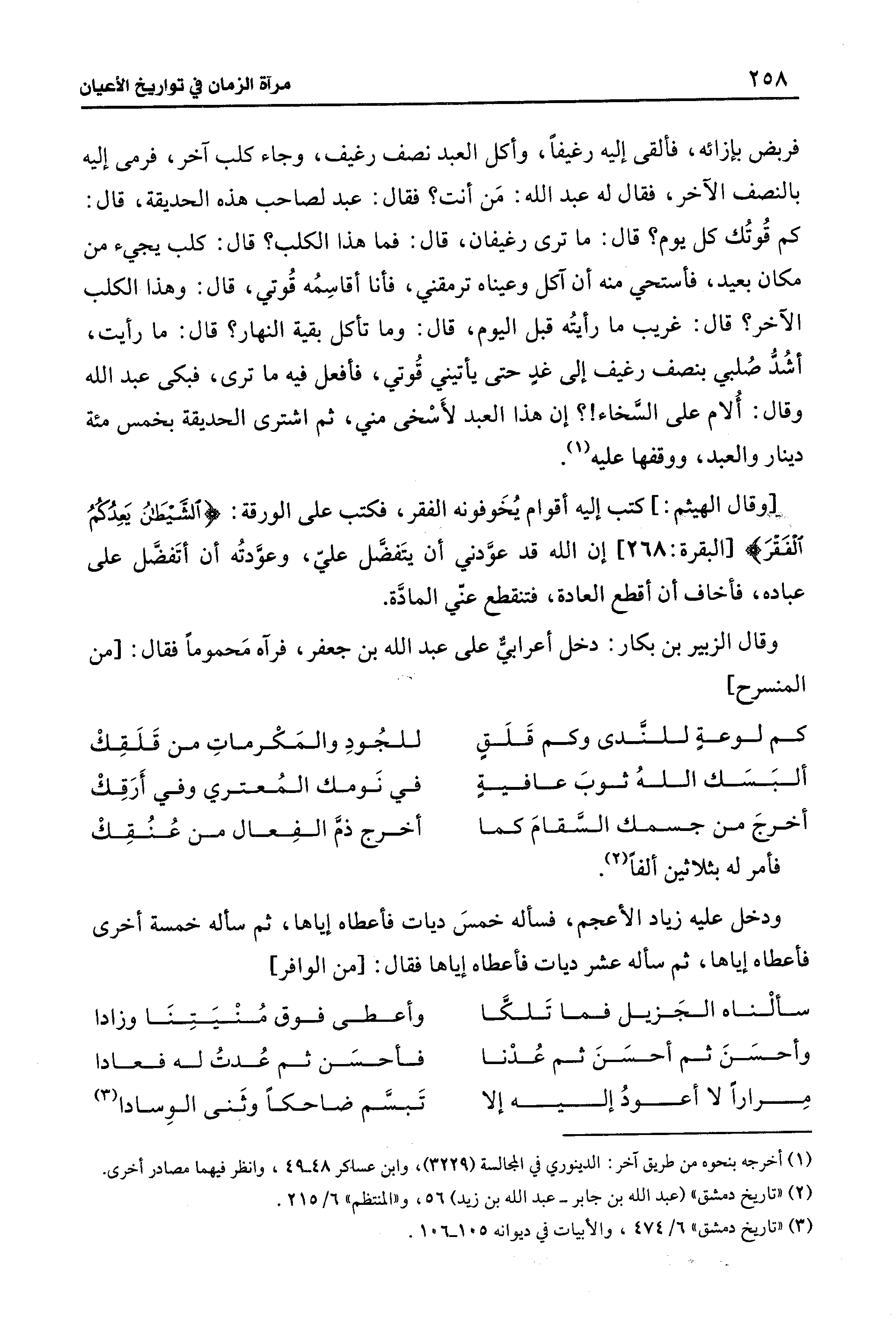 فربض بإزائه، فألقى إليه رغيفًا، وأكل العبد نصف رغيف، وجاء كلب آخر، فرمى إليه بالنصف الآخر، فقال له عبد الله: مَن أنت؟ فقال: عبد لصاحب هذه الحديقة، قال: كم قُوتُك كل يوم؟ قال: ما ترى رغيفان، قال: فما هذا الكلب؟ قال: كلب يجيء من مكان بعيد، فأستحي منه أن آكل وعيناه ترمقني، فأنا أقاسِمُه قُوتي، قال. وهذا الكلب الآخر؛ قال: غريب ما رأيتُه قبل اليوم، قال: وما تأكل بقية النهار؟ قال: ما رأيت، أشُدُّ صُلبي بنصف رغيف إلى غدٍ حتى يأتيني قُوتي، فافعل فيه ما ترى، فبكى عبد الله وقال: أُلام على السَّخاء! ؟ إن هذا العبد لأَسْخى مني، ثم اشترى الحديقة بخمس مئة دينار والعبد، ووقفها عليه (¬1).