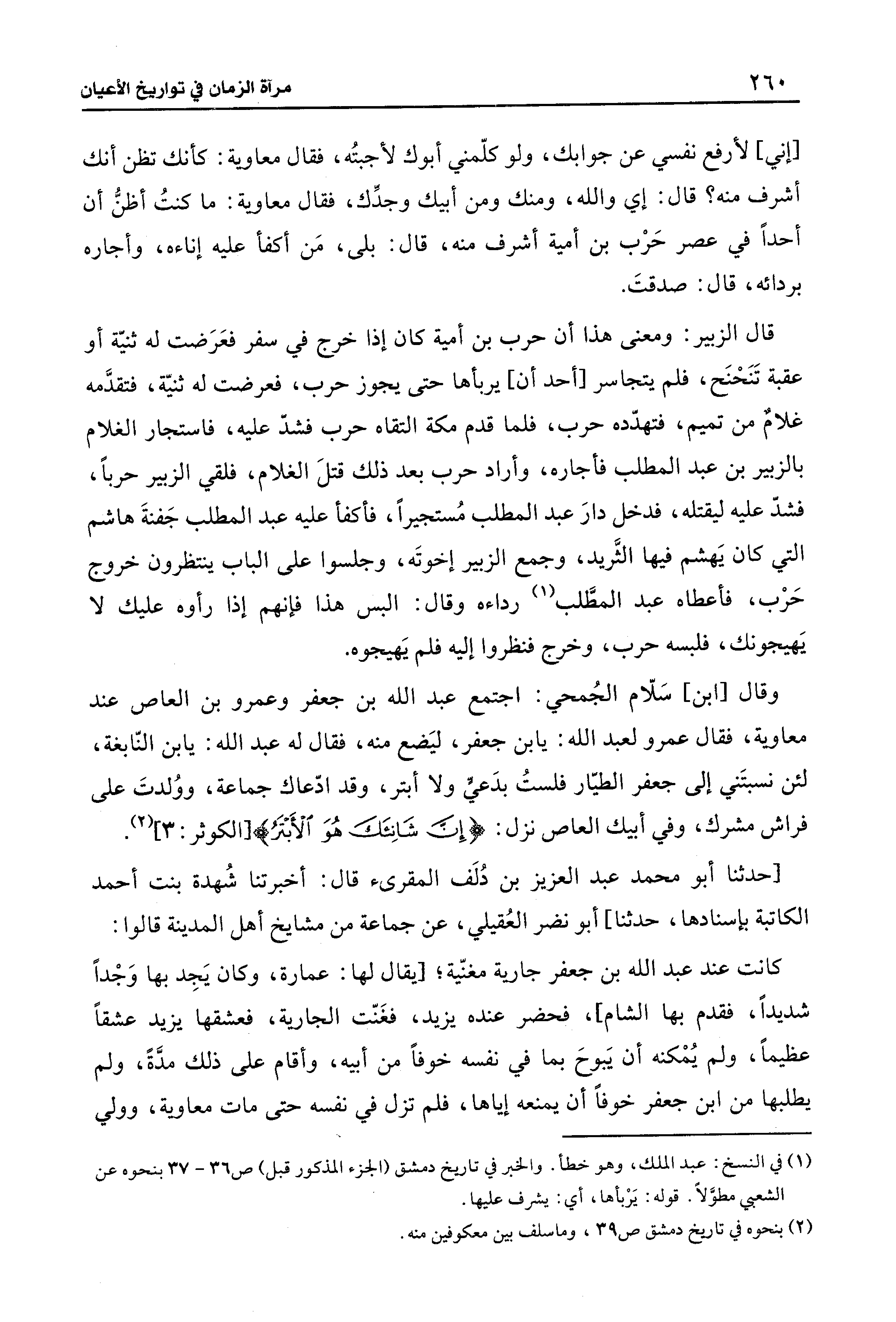 [إني] لأرفع نفسي عن جوابك، ولو كلّمني أبوك لأجبتُه، فقال معاوية: كأنك تظن أنك أشرف منه؟ قال: إي والله، ومنك ومن أبيك وجدِّك، فقال معاوية: ما كنتُ أظنُّ أن أحدًا في عصر حَرْب بن أمية أشرف منه، قال. بلى، مَن أكفأ عليه إناءه، وأجاره بردائه، قال: صدقتَ.