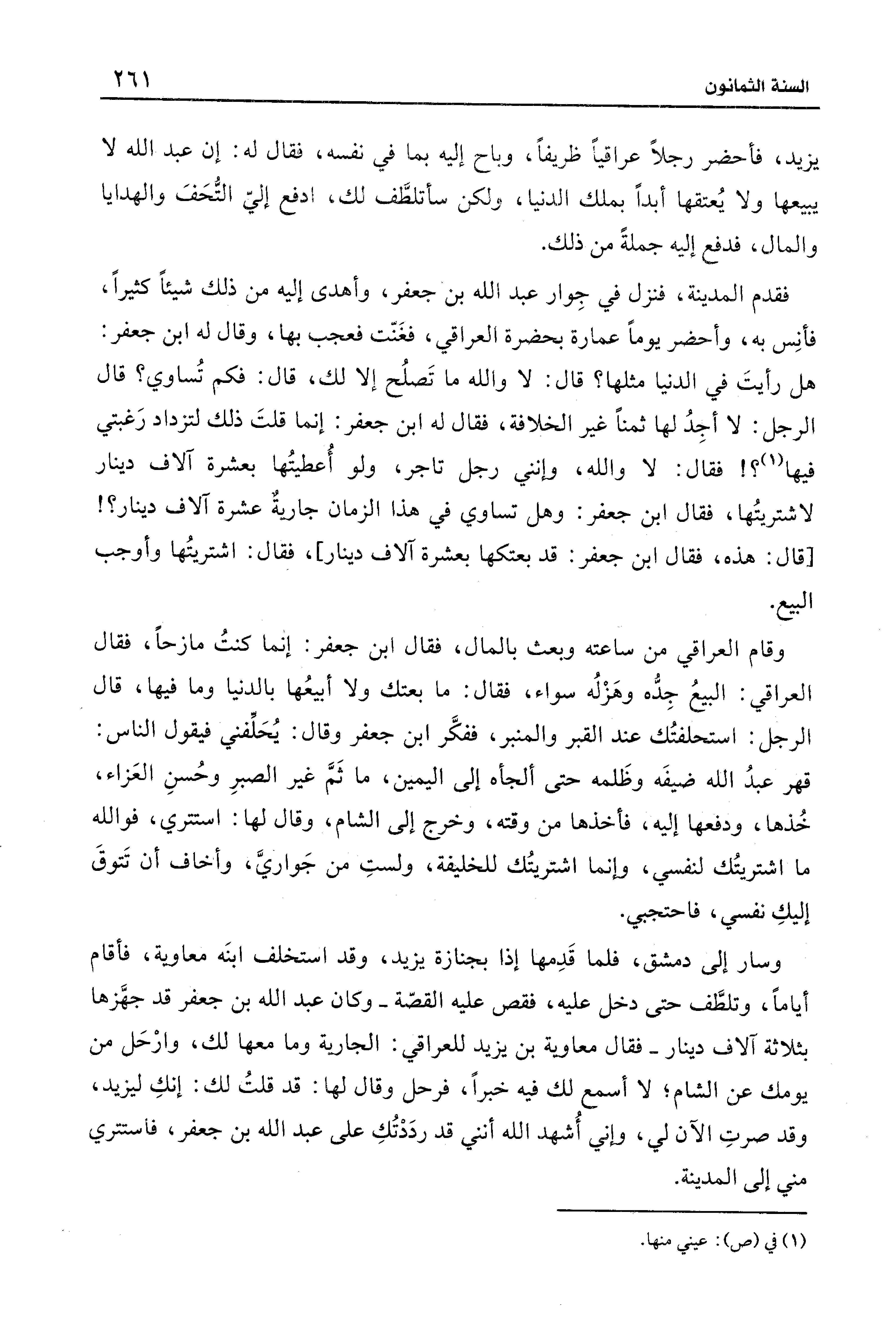 فقدم المدينة، فنزل في جِوار عبد الله بن جعفر، وأهدى إليه من ذلك شيئًا كثيرًا، فأنِس به، وأحضر يومًا عمارة بحضرة العراقي، فغَنّت فعجب بها، وقال له ابن جعفر: هل رأيتَ في الدنيا مثلها؟ قال: لا والله ما تَصلُح إلا لك، قال: فكم تُساوي؟ قال الرجل: لا أجِدُ لها ثمنًا غير الخلافة، فقال له ابن جعفر: إنما قلتَ ذلك لتزداد رَغبتي فيها (¬1)؟ ! فقال: لا والله، وإنني رجل تاجر، ولو أُعطيتُها بعشرة آلاف دينار لاشتريتُها، فقال ابن جعفر: وهل تساوي في هذا الزمان جاريةٌ عشرة آلاف دينار؟ ! [قال: هذه، فقال ابن جعفر. قد بعتكها بعشرة آلاف دينار]، فقال: اشتريتُها وأوجب البيع.