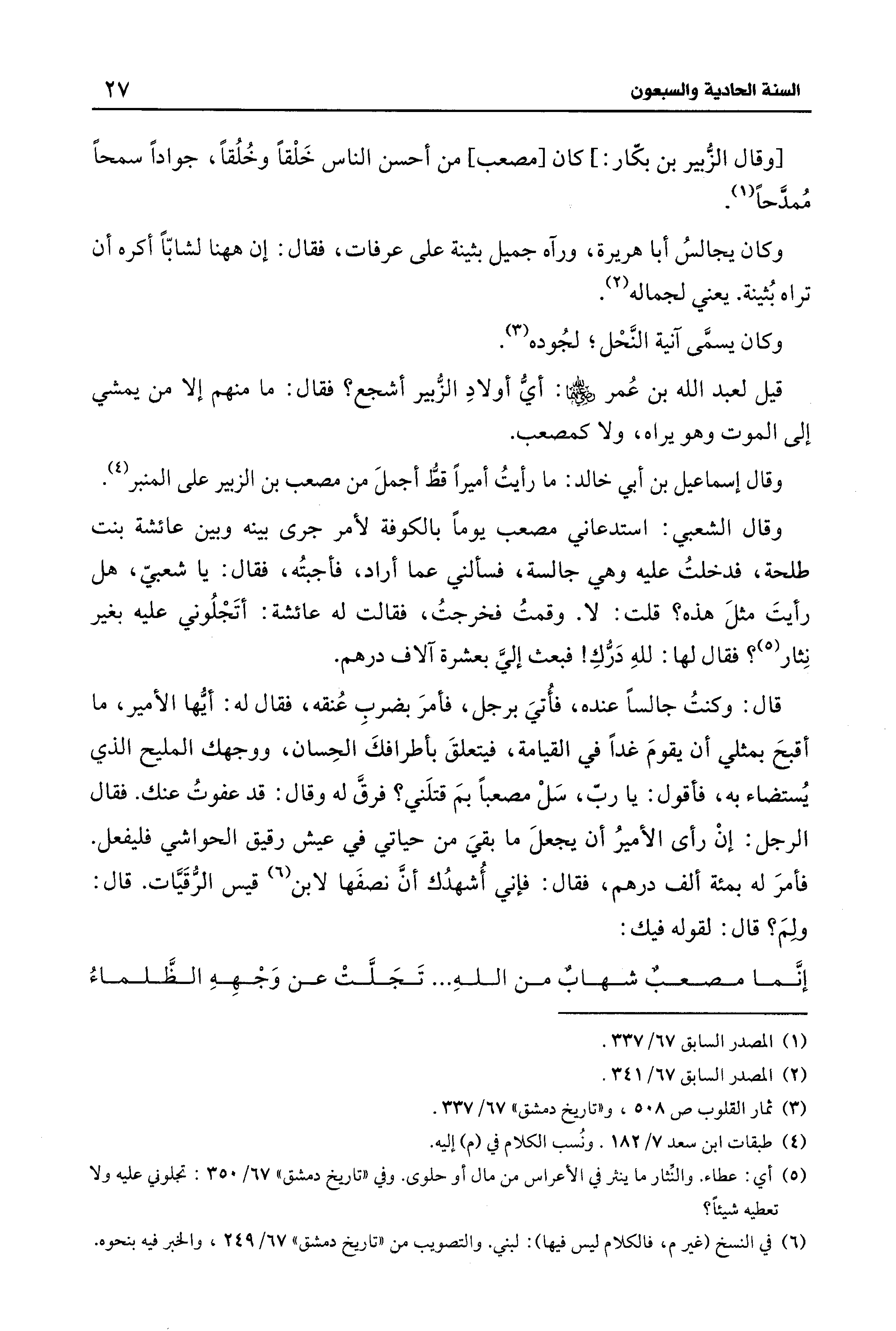 [وقال الزُّبير بن بكّار: ] كان [مصعب] من أحسن الناس خَلْقًا وخُلُقًا، جوادًا سمحًا مُمدَّحًا (¬1).