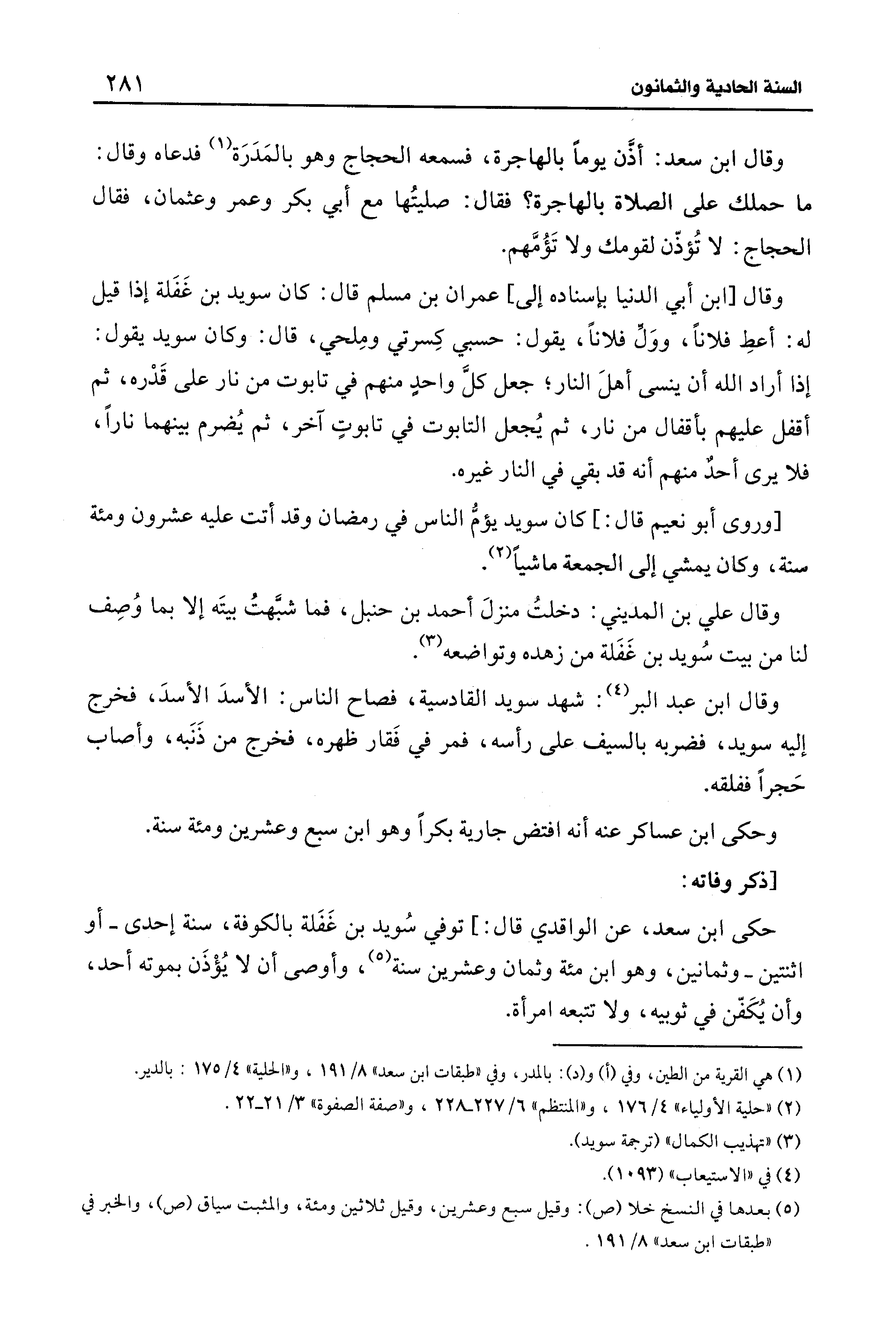 حكى ابن سعد، عن الواقدي قال: ] توفي سُويد بن غَفَلة بالكوفة، سنة إحدى -أو اثنتين- وثمانين، وهو ابن مئة وثمان وعشرين سنة (¬5)، وأوصى أن لا يُؤْذَن بموته أحد، وأن يُكَفّن في ثوبيه، ولا تتبعه امرأة.