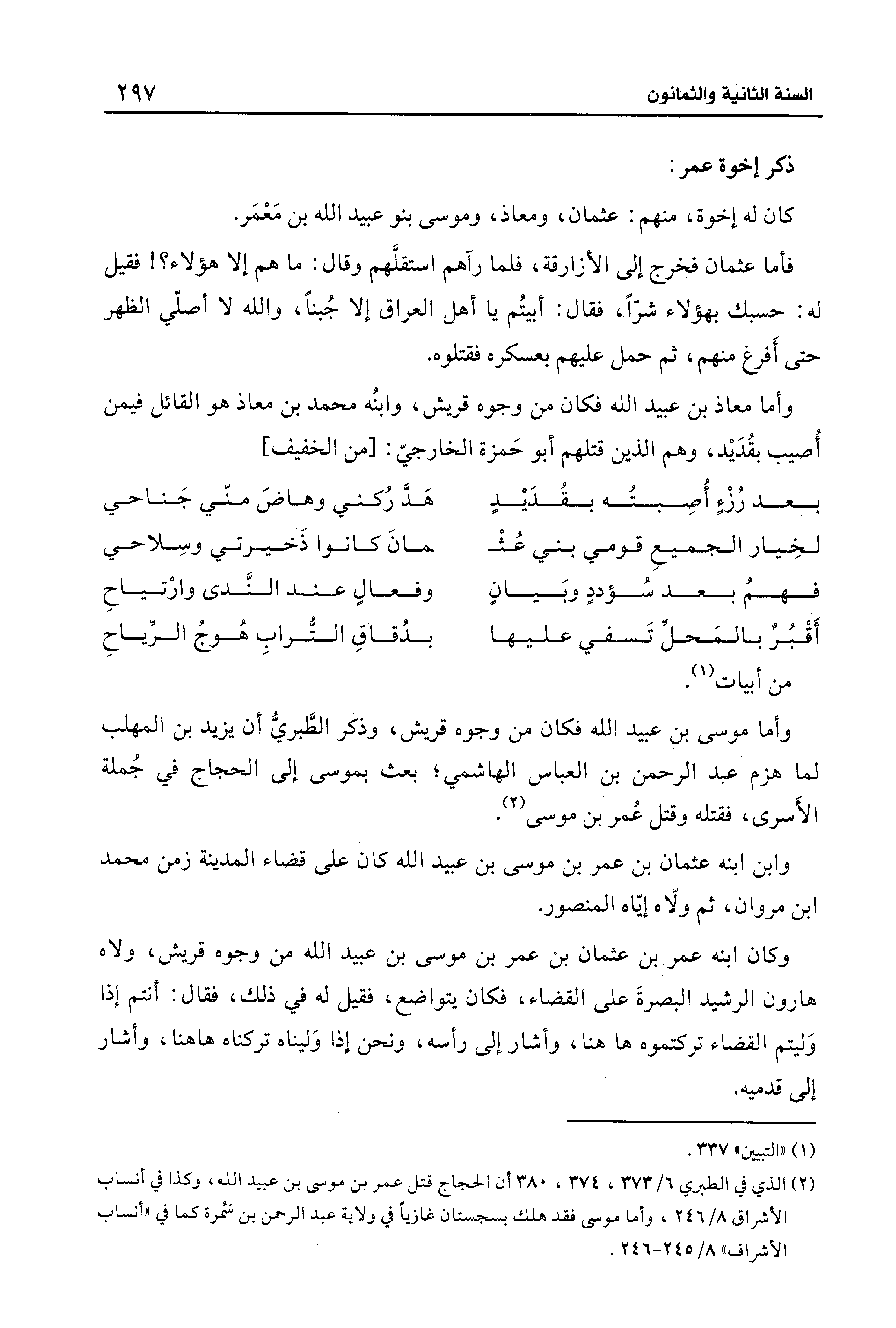 (¬2) الذي في الطبري 6/ 373، 374، 380 أن الحجاج قتل عمر بن موسى بن عبيد الله، وكذا في أنساب الأشراق 8/ 246، وأما موسى فقد هلك بسجستان غازيًا في ولاية عبد الرحمن بن سَمُرة كما في "أنساب الأشراف" 8/ 245 - 246.