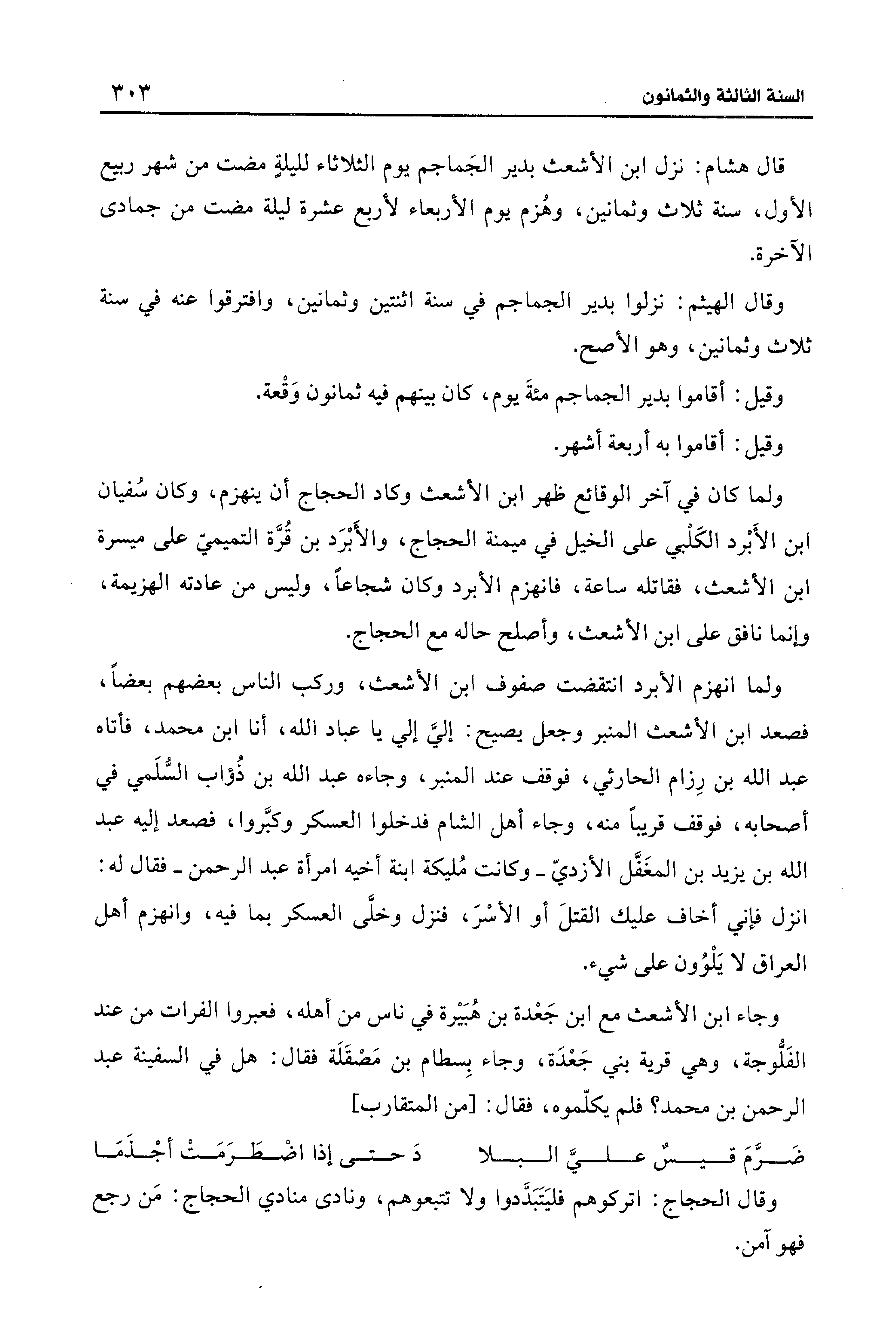 قال هشام: نزل ابن الأشعث بدير الجَماجم يوم الثلاثاء لليلةٍ مضت من شهر ربيع الأول، سنة ثلاث وثمانين، وهُزم يوم الأربعاء لأربع عشرة ليلة مضت من جمادى الآخرة.