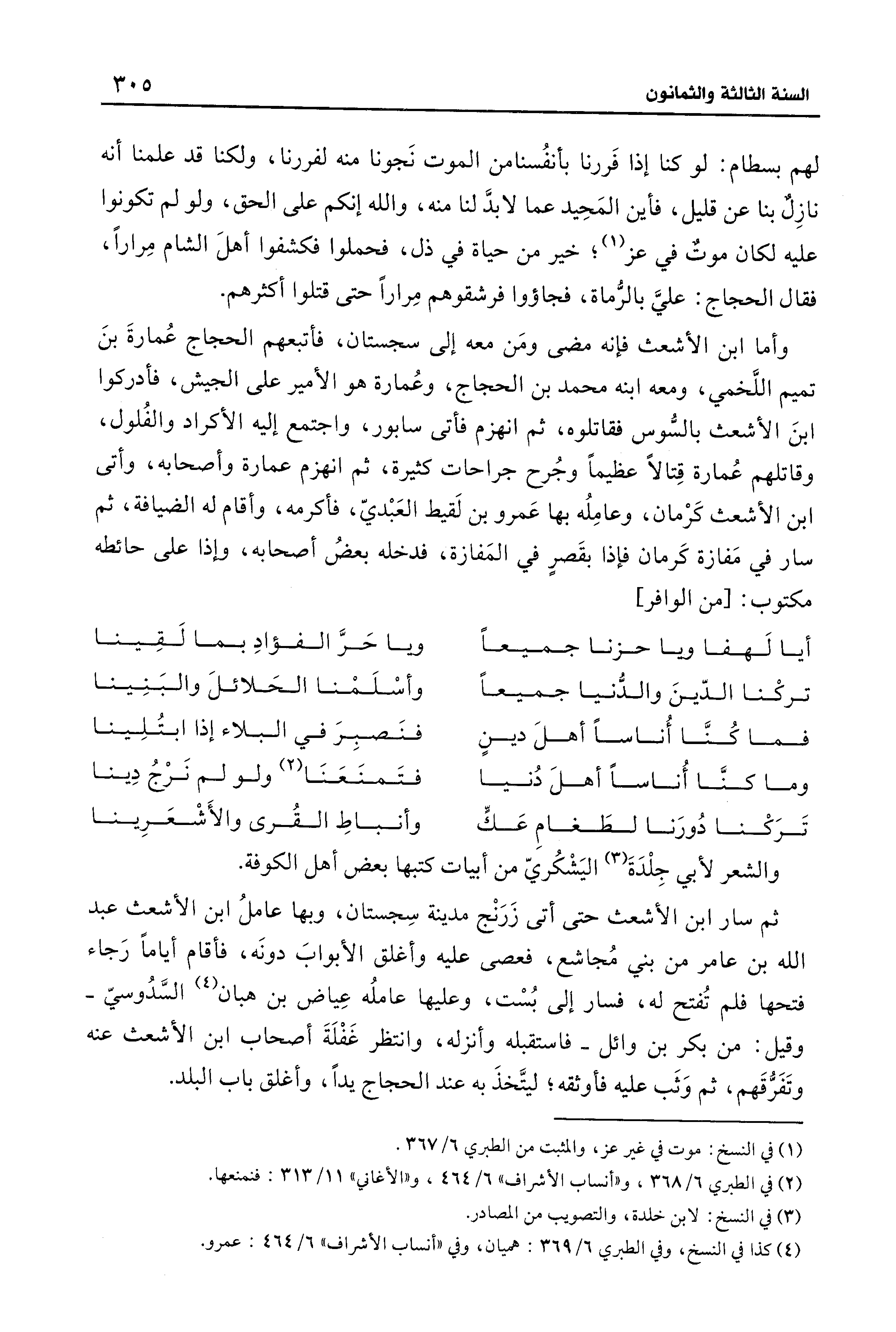 وأما ابن الأشعث فإنه مضى ومَن معه إلى سجستان، فأتبعهم الحجاج عُمارةَ بنَ تميم اللَّخمي، ومعه ابنه محمد بن الحجاج، وعُمارة هو الأمير على الجيش، فأدركوا ابنَ الأشعث بالسُّوس فقاتلوه، ثم انهزم فأتى سابور، واجتمع إليه الأكراد والفُلول، وقاتلهم عُمارة قِتالًا عظيمًا وجُرح جراحات كثيرة، ثم انهزم عمارة وأصحابه، وأتى ابن الأشعث كَرْمان، وعامِلُه بها عَمرو بن لَقيط العَبْديّ، فأكرمه، وأقام له الضيافة، ثم سار في مَفازة كَرمان فإذا بقَصرٍ في المَفازة، فدخله بعضُ أصحابه، وإذا على حائطه مكتوب: [من الوافر]