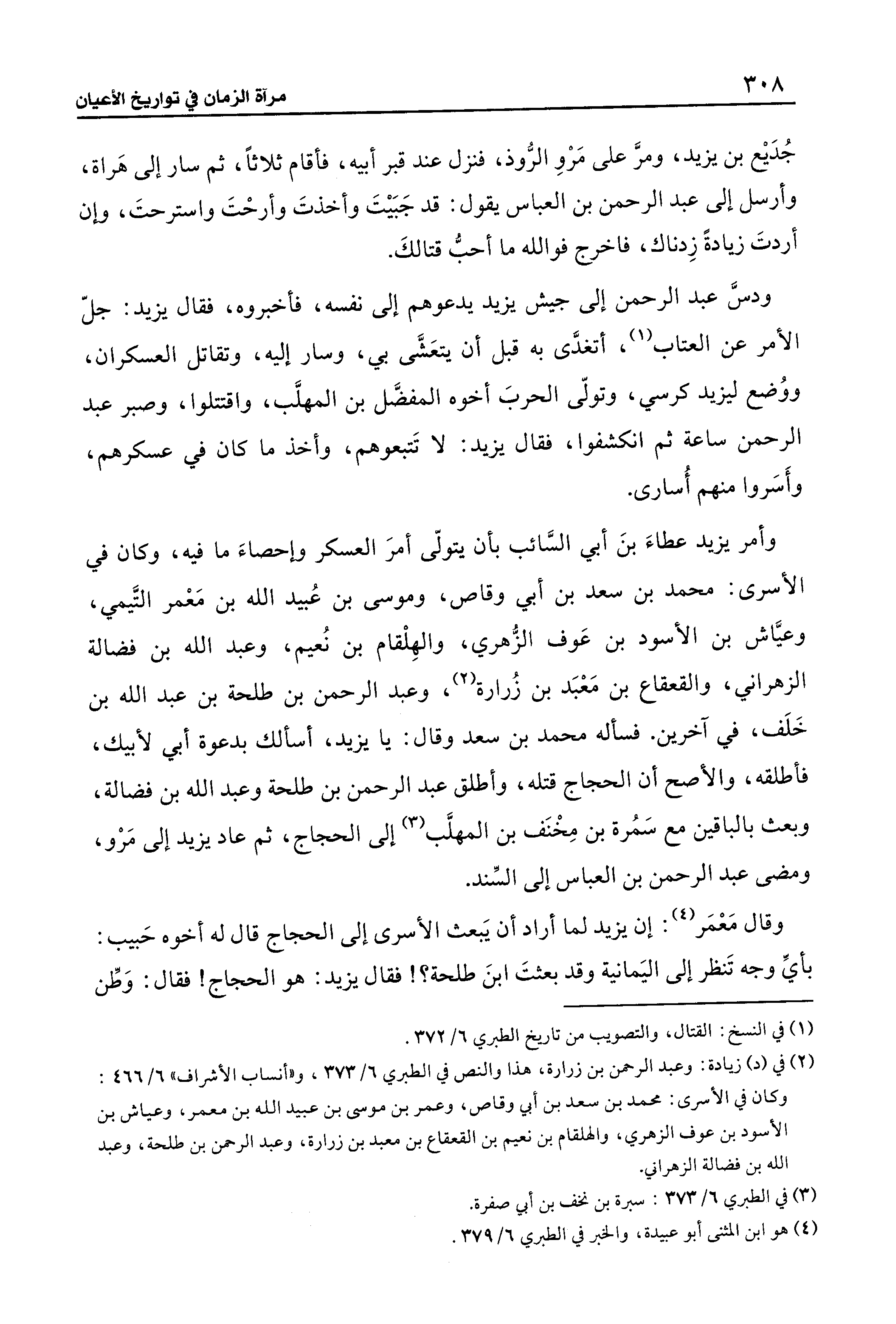 وأمر يزيد عطاءَ بنَ أبي السَّائب بأن يتولّى أمرَ العسكر وإحصاءَ ما فيه، وكان في الأسرى: محمد بن سعد بن أبي وقاص، وموسى بن عُبيد الله بن مَعْمر التَّيمي، وعيَّاش بن الأسود بن عَوف الزُّهوي، والهِلْقام بن نُعيم، وعبد الله بن فضالة الزهراني، والقعقاع بن مَعْبَد بن زُرارة (¬2)، وعبد الرحمن بن طلحة بن عبد الله بن خَلَف، في آخرين. فسأله محمد بن سعد وقال: يا يزيد، أسألك بدعوة أبي لأبيك، فأطلقه، والأصح أن الحجاج قتله، وأطلق عبد الرحمن بن طلحة وعبد الله بن فضالة، وبعث بالباقين مع سَمُرة بن مِخْنَف بن المهلَّب (¬3) إلى الحجاج، ثم عاد يزيد إلى مَرْو، ومضى عبد الرحمن بن العباس إلى السِّند.