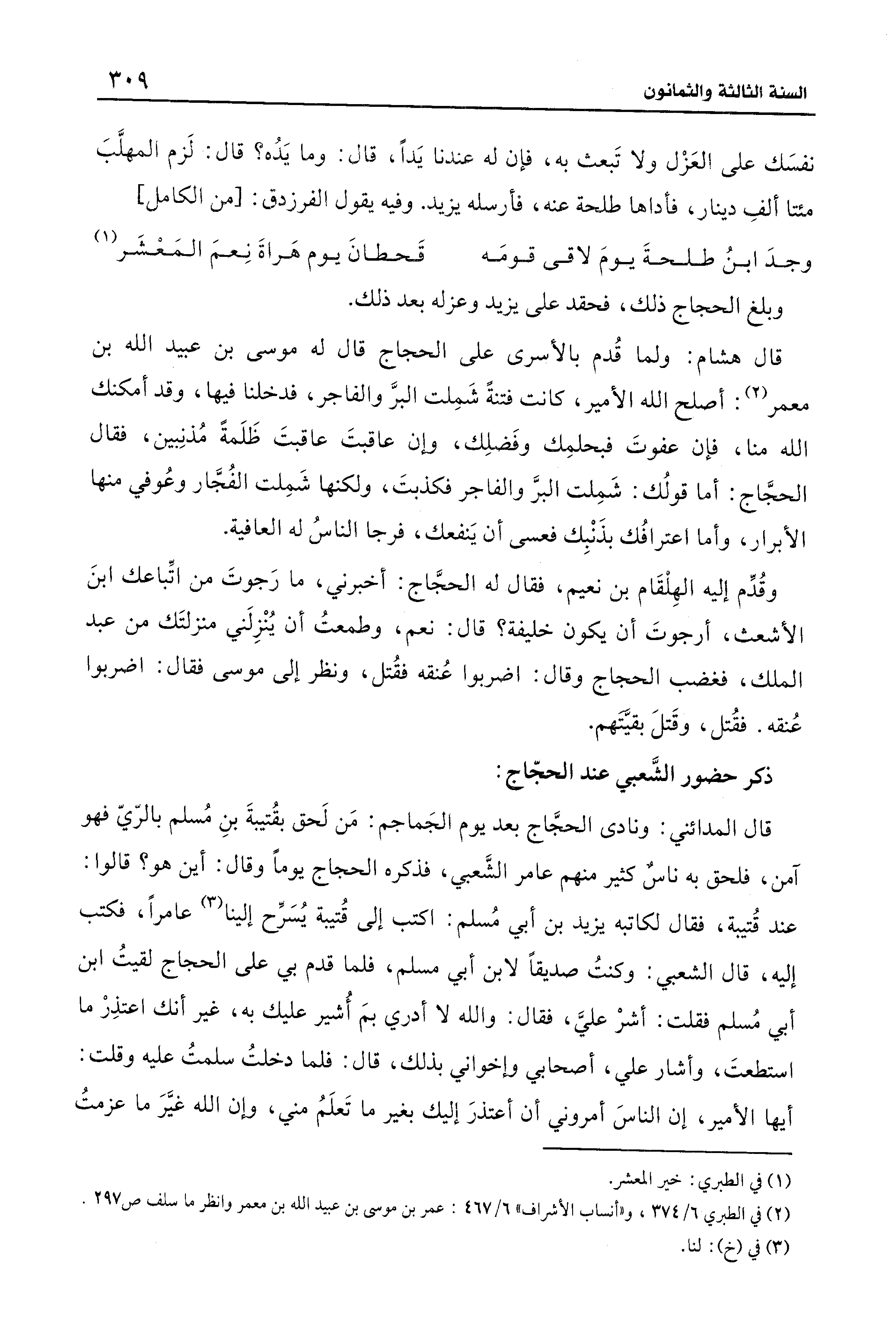 قال المدائني: ونادى الحجَّاج بعد يوم الجَماجم: مَن لَحق بقُتيبةَ بنِ مُسلم بالرّيّ فهو آمن، فلحق به ناسٌ كثير منهم عامر الشَّعبي، فذكره الحجاج يومًا وقال: أين هو؟ قالوا: عند قُتيبة، فقال لكاتبه يزيد بن أبي مُسلم: اكتب إلى قُتيبة يُسَرِّح إلينا (¬3) عامرًا، فكتب إليه، قال الشعبي: وكنتُ صديقًا لابن أبي مسلم، فلما قدم بي على الحجاج لقيتُ ابن أبي مُسلم فقلت: أشرْ عليَّ، فقال: والله لا أدري بمَ أُشير عليك به، غير أنك اعتذِرْ ما استطعتَ، وأشار علي، أصحابي وإخواني بذلك، قال: فلما دخلتُ سلمتُ عليه وقلت: أيها الأمير، إن الناسَ أمروني أن أعتذرَ إليك بغير ما تَعلَمُ مني، وإن الله غيَّرَ ما عزمتُ