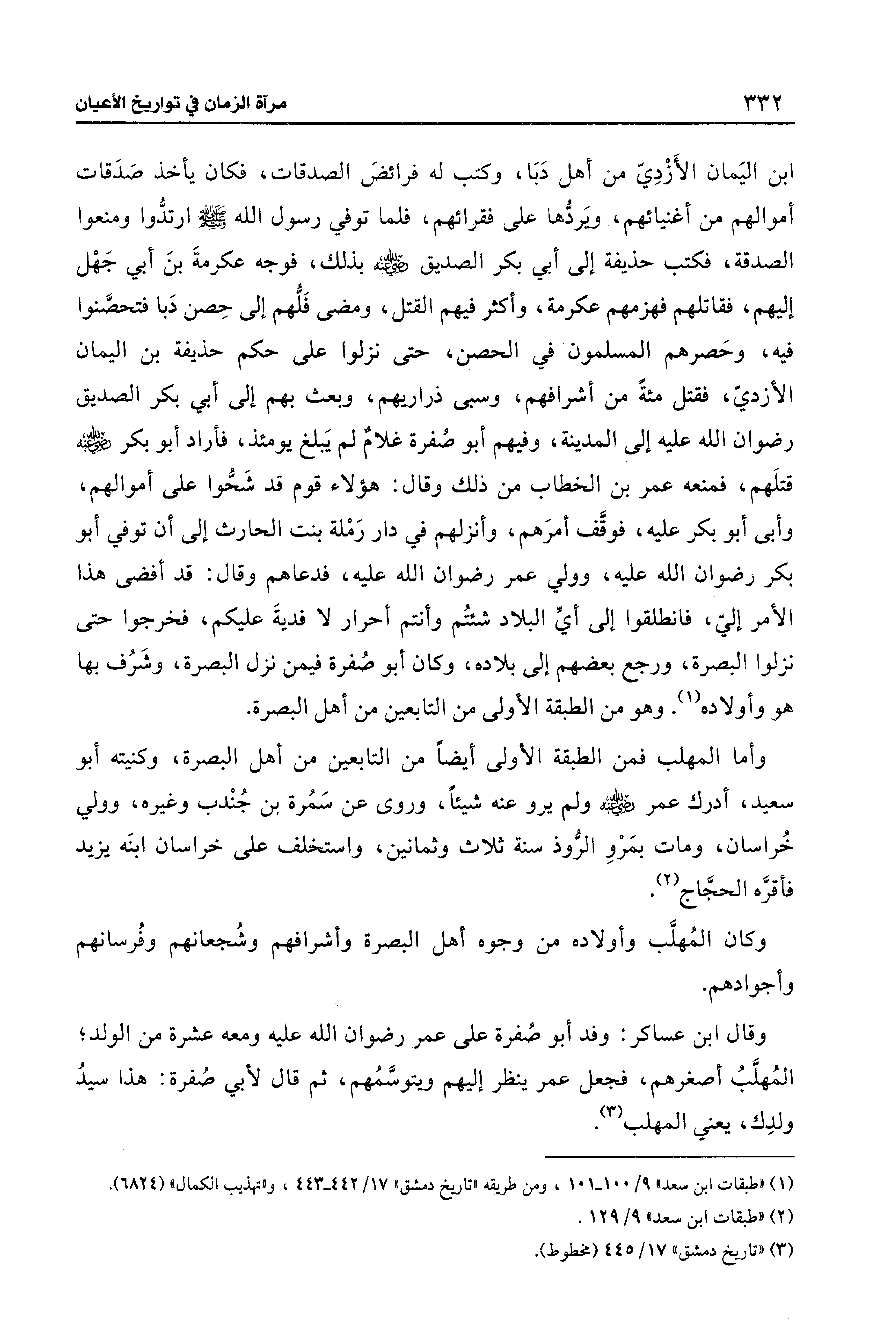 ابن اليَمان الأَزْدِيّ من أهل دَبَا، وكتب له فرائضَ الصدقات، فكان يأخذ صَدَقات أموالهم من أغنيائهم، ويَردُّها على فقرائهم، فلما توفي رسول الله صلى الله عليه وسلم ارتدُّوا ومنعوا الصدقة، فكتب حذيفة إلى أبي بكر الصديق رضي الله عنه بذلك، فوجه عكرمةَ بنَ أبي جَهْل إليهم، فقاتلهم فهزمهم عكرمة، وأكثر فيهم القتل، ومضى فَلُّهم إلى حِصن دَبا فتحصَّنوا فيه، وحَصرهم المسلمون في الحصن، حتى نزلوا على حكم حذيفة بن اليمان الأزديّ، فقتل مئةً من أشرافهم، وسبى ذراريهم، وبعث بهم إلى أبي بكر الصديق رضوان الله عليه إلى المدينة، وفيهم أبو صُفرة غلامٌ لم يَبلغ يومئذ، فأراد أبو بكر رضي الله عنه قتلَهم، فمنعه عمر بن الخطاب من ذلك وقال: هؤلاء قوم قد شَحُّوا على أموالهم، وأبي أبو بكر عليه، فوقَّف أمرَهم، وأنزلهم في دار رَمْلة بنت الحارث إلى أن توفي أبو بكر رضوان الله عليه، وولي عمر رضوان الله عليه، فدعاهم وقال: قد أفضى هذا الأمر إليّ، فانطلقوا إلى أيِّ البلاد شئتُم وأنتم أحرار لا فديةَ عليكم، فخرجوا حتى نزلوا البصرة، ورجع بعضهم إلى بلاده، وكان أبو صُفرة فيمن نزل البصرة، وشَرُف بها هو وأولاده (¬1). وهو من الطبقة الأولى من التابعين من أهل البصرة.