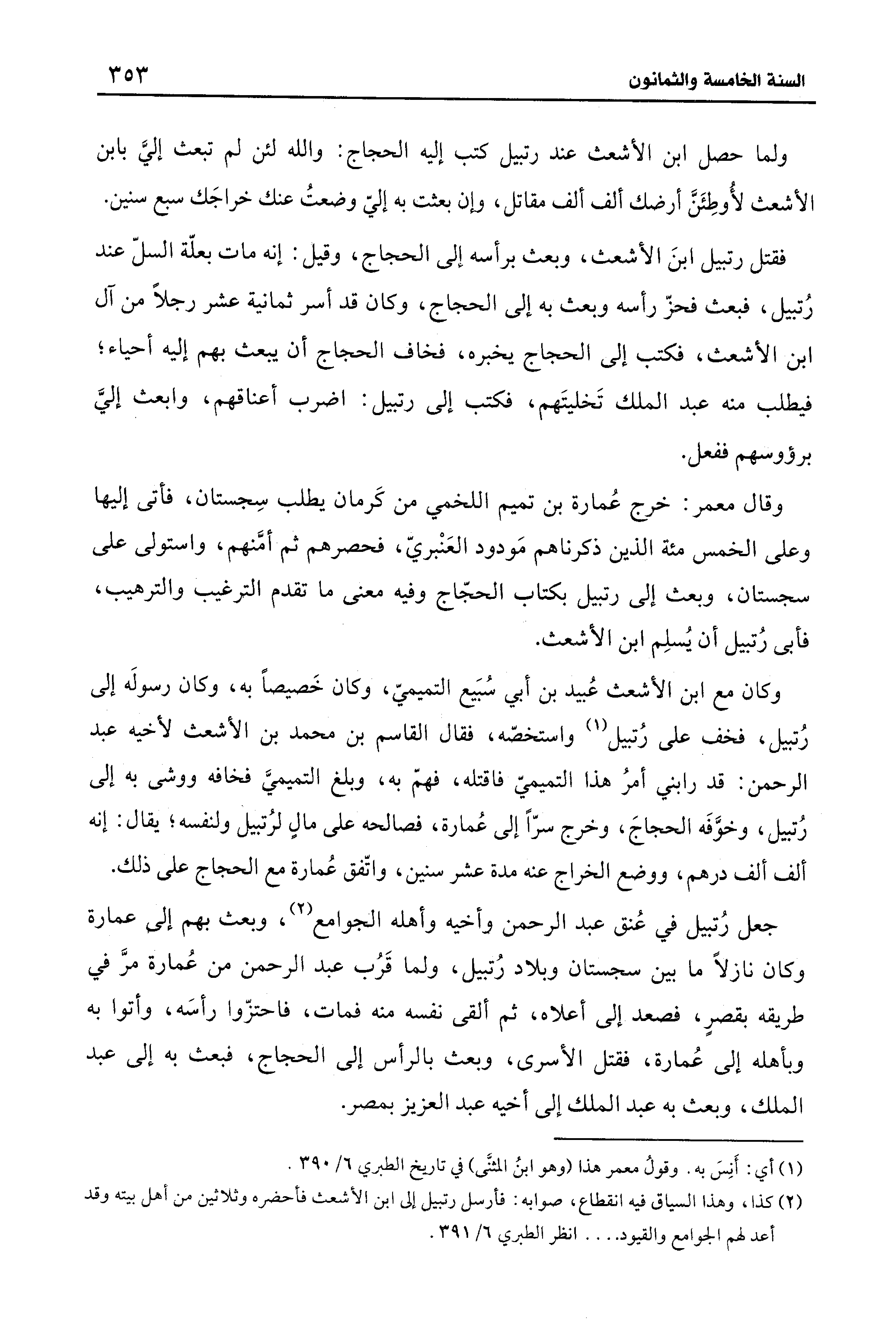 (¬2) كذا، وهذا السياق فيه انقطاع، صوابه: فأرسل رتبيل إلى ابن الأشعث فأحضره وثلاثين من أهل بيته وقد أعد لهم الجوامع والقيود .... انظر الطبري 6/ 391.