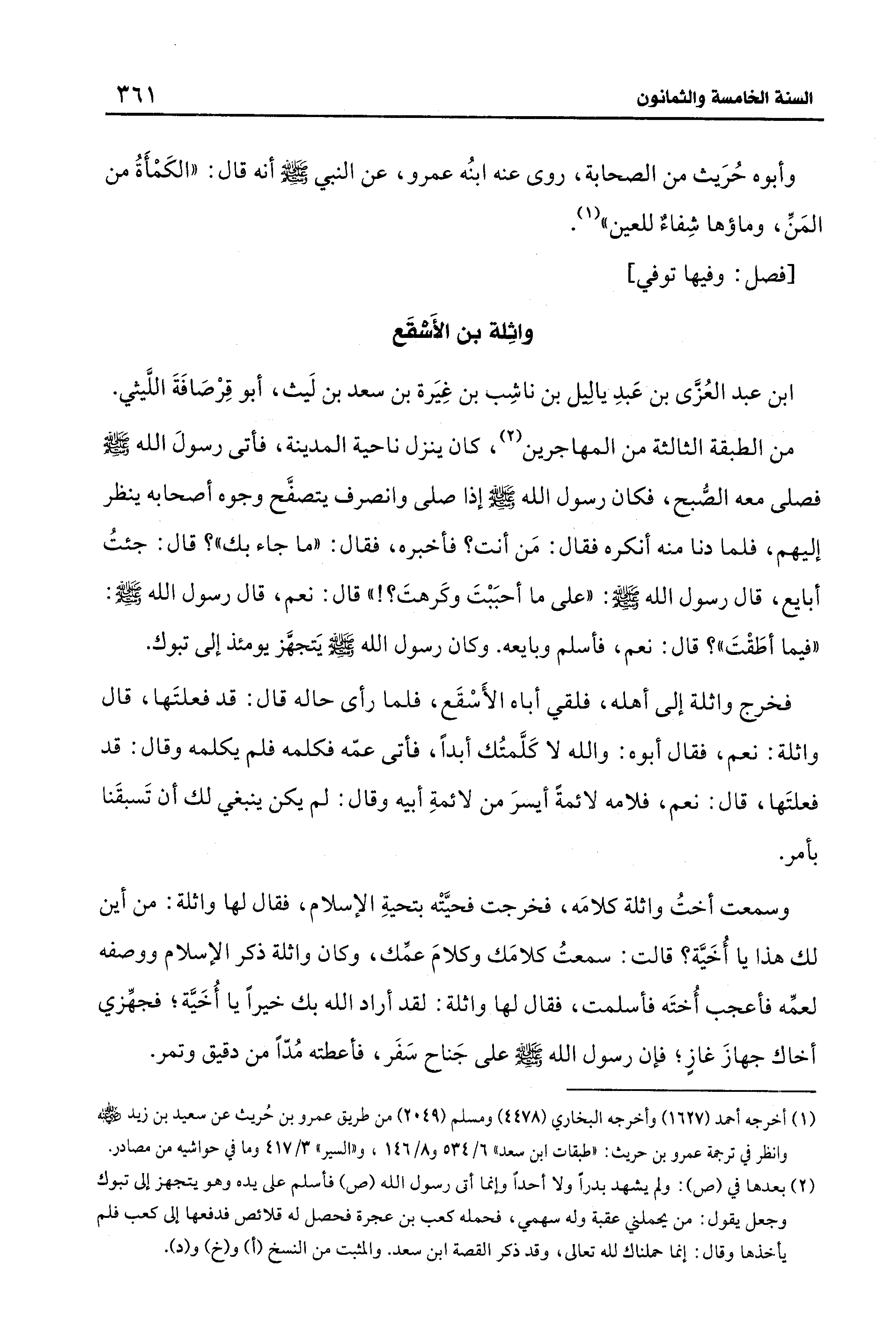 وسمعت أختُ واثلة كلامَه، فخرجت فحيَّتْه بتحيةِ الإِسلام، فقال لها واثلة: من أين لك هذا يا أُخَيَّة؟ قالت: سمعتُ كلامَك وكلامَ عمِّك، وكان واثلة ذكر الإِسلام ووصفه لعمِّه فأعجب أُختَه فأسلمت، فقال لها واثلة: لقد أراد الله بك خيرًا يا أُخَية؛ فجهّزي أخاك جهازَ غازٍ، فإن رسول الله - صلى الله عليه وسلم - على جَناح سَفَر، فأعطته مُدًّا من دقيق وتمر.