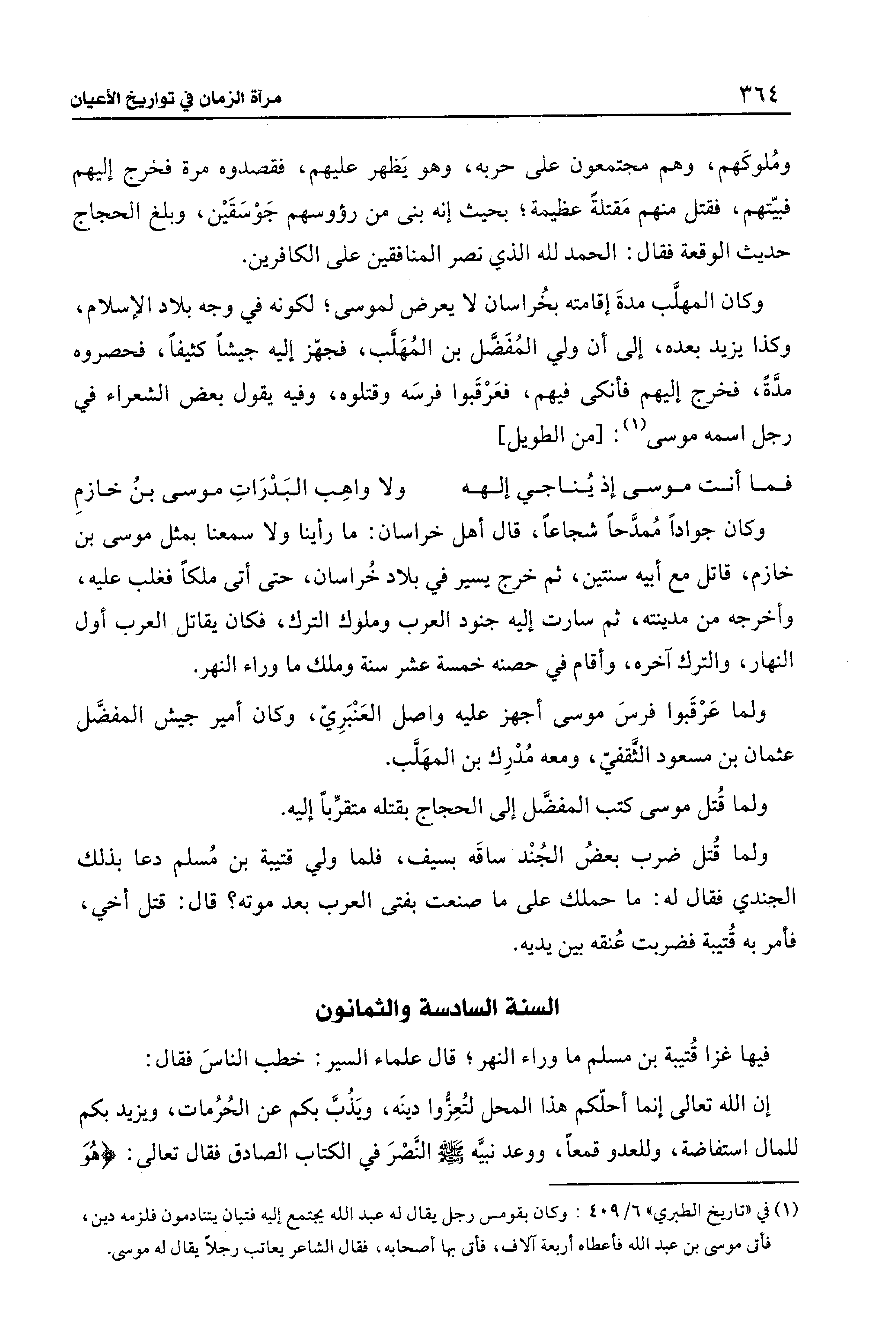 وكان المهلَّب مدةَ إقامته بخُراسان لا يعرض لموسى؛ لكونه في وجه بلاد الإِسلام، وكذا يزيد بعده، إلى أن ولي المُفَضَّل بن المُهَلَّب، فجهّز إليه جيشًا كثيفًا، فحصروه مدَّة، فخرج إليهم فأنكى فيهم، فعَرقَبوا فرسَه وقتلوه، وفيه يقول بعض الشعراء في رجل اسمه موسى (¬1): [من الطويل]